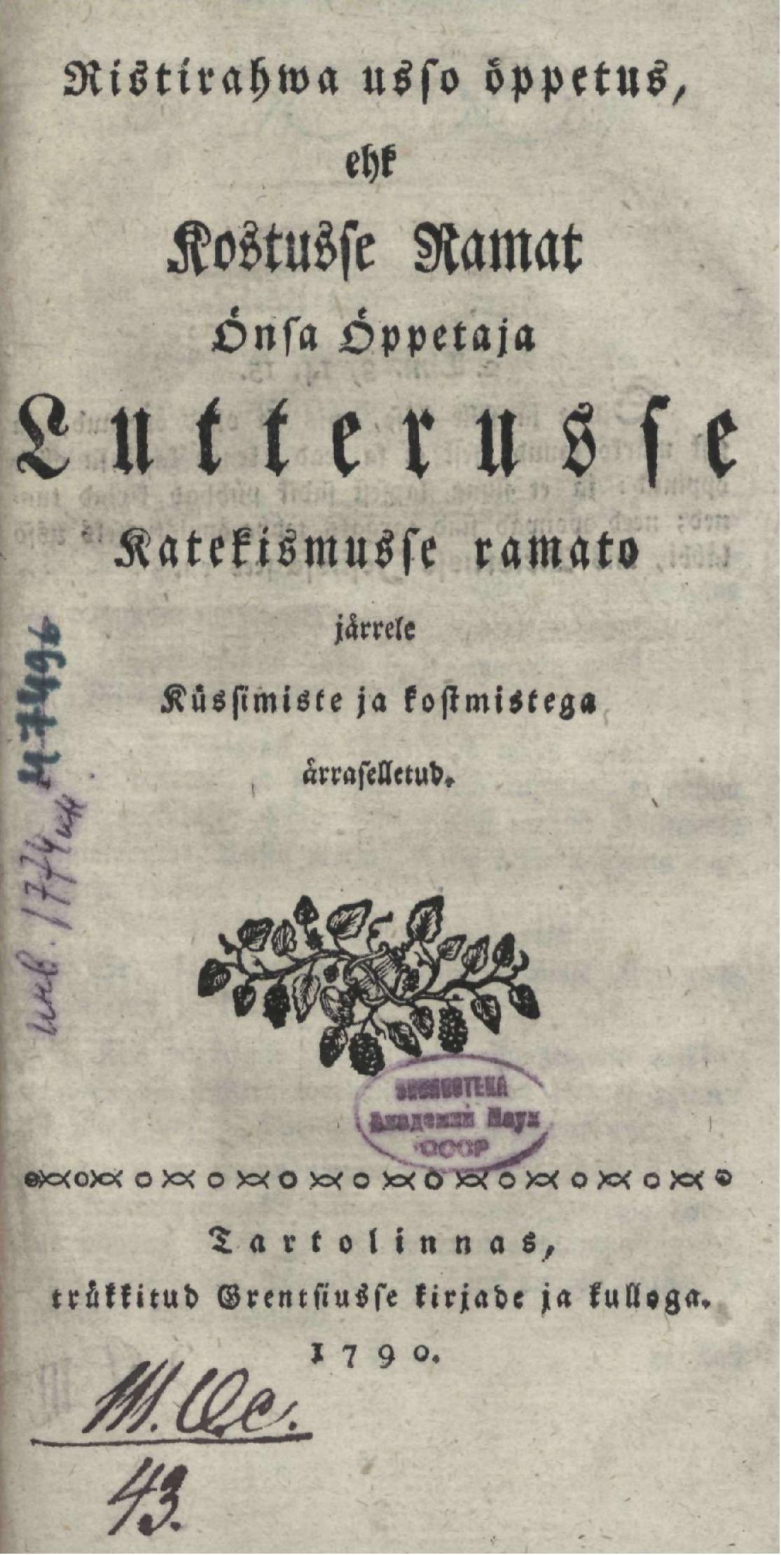 Ilmunud: Tartu, M. G. Grenzius, 1790 (Tartu, M. G. Grenzius)