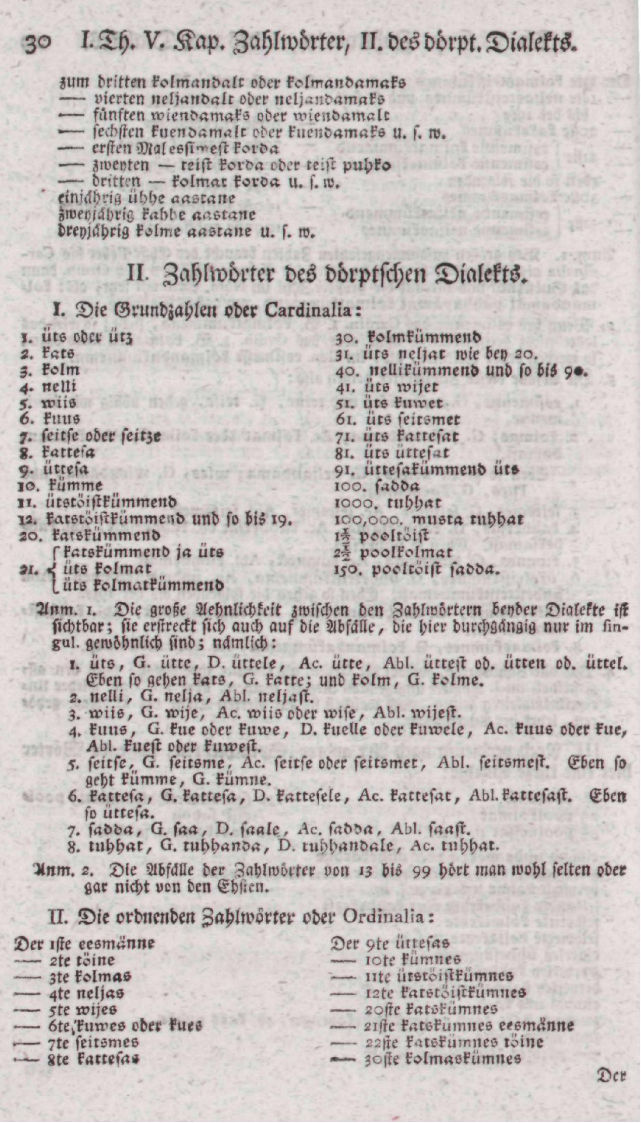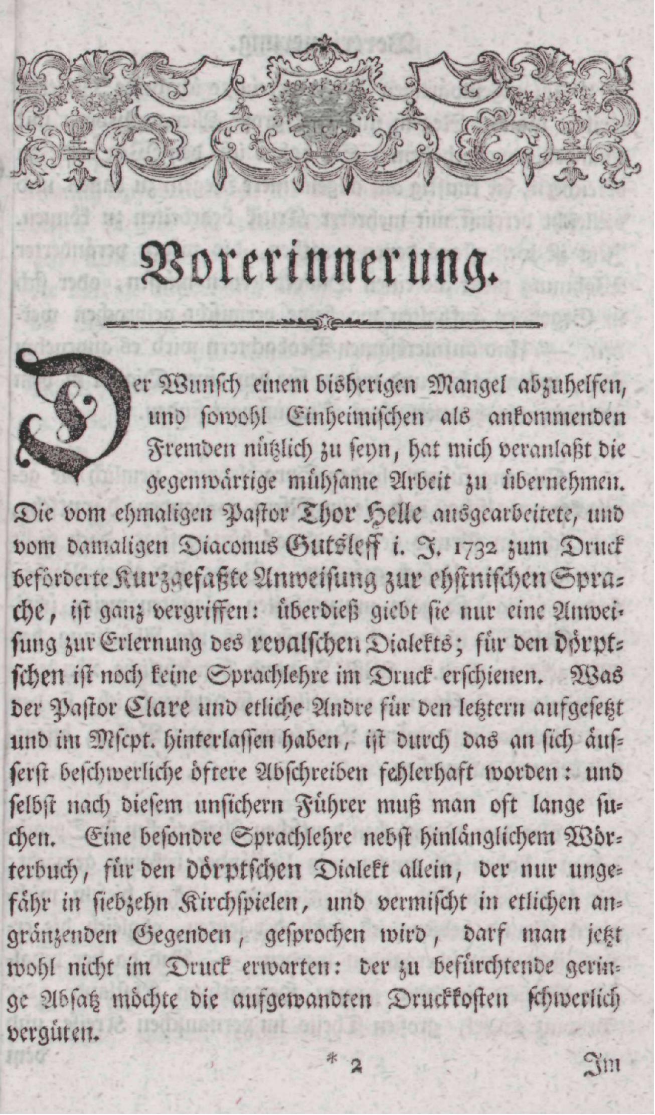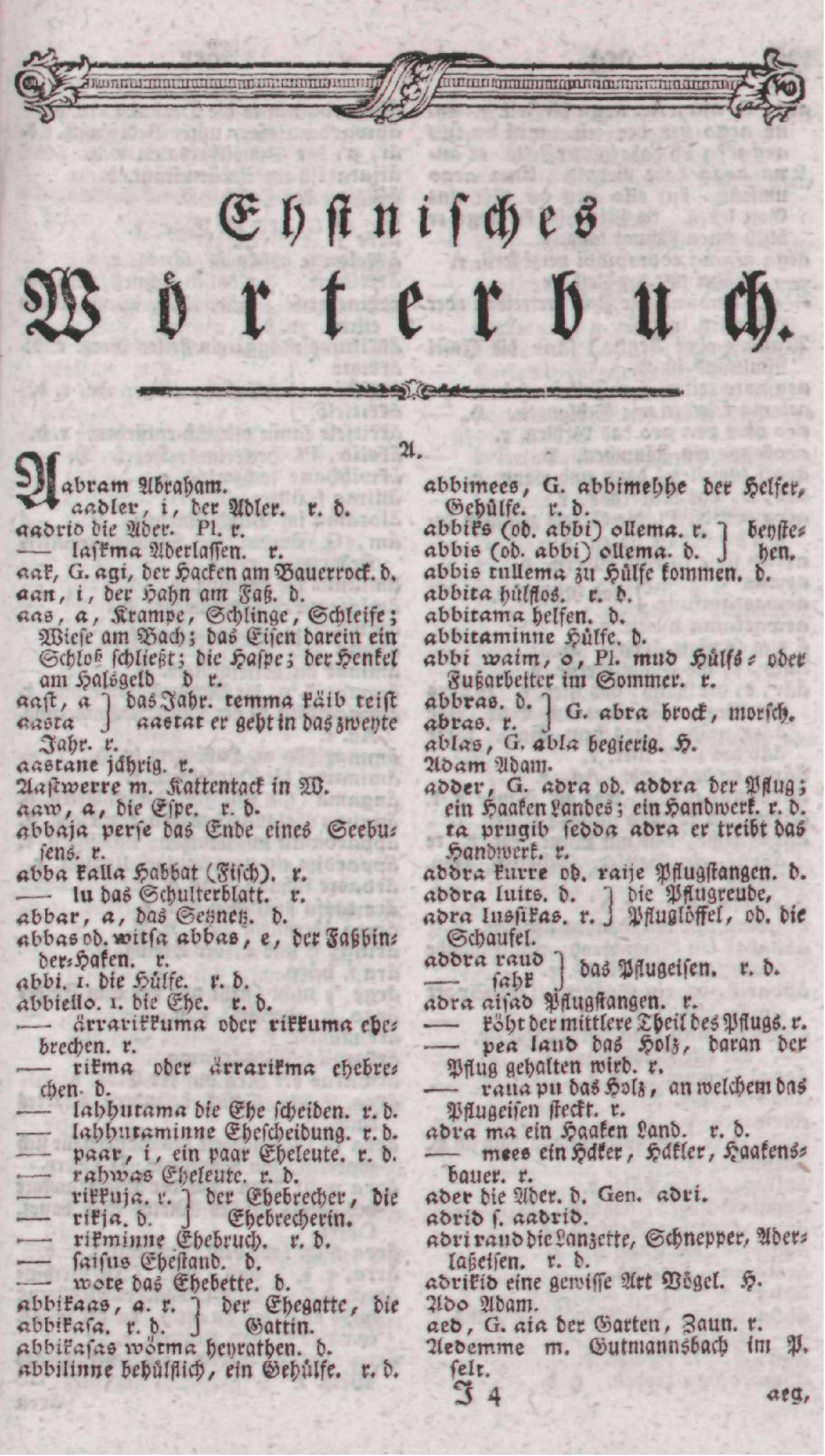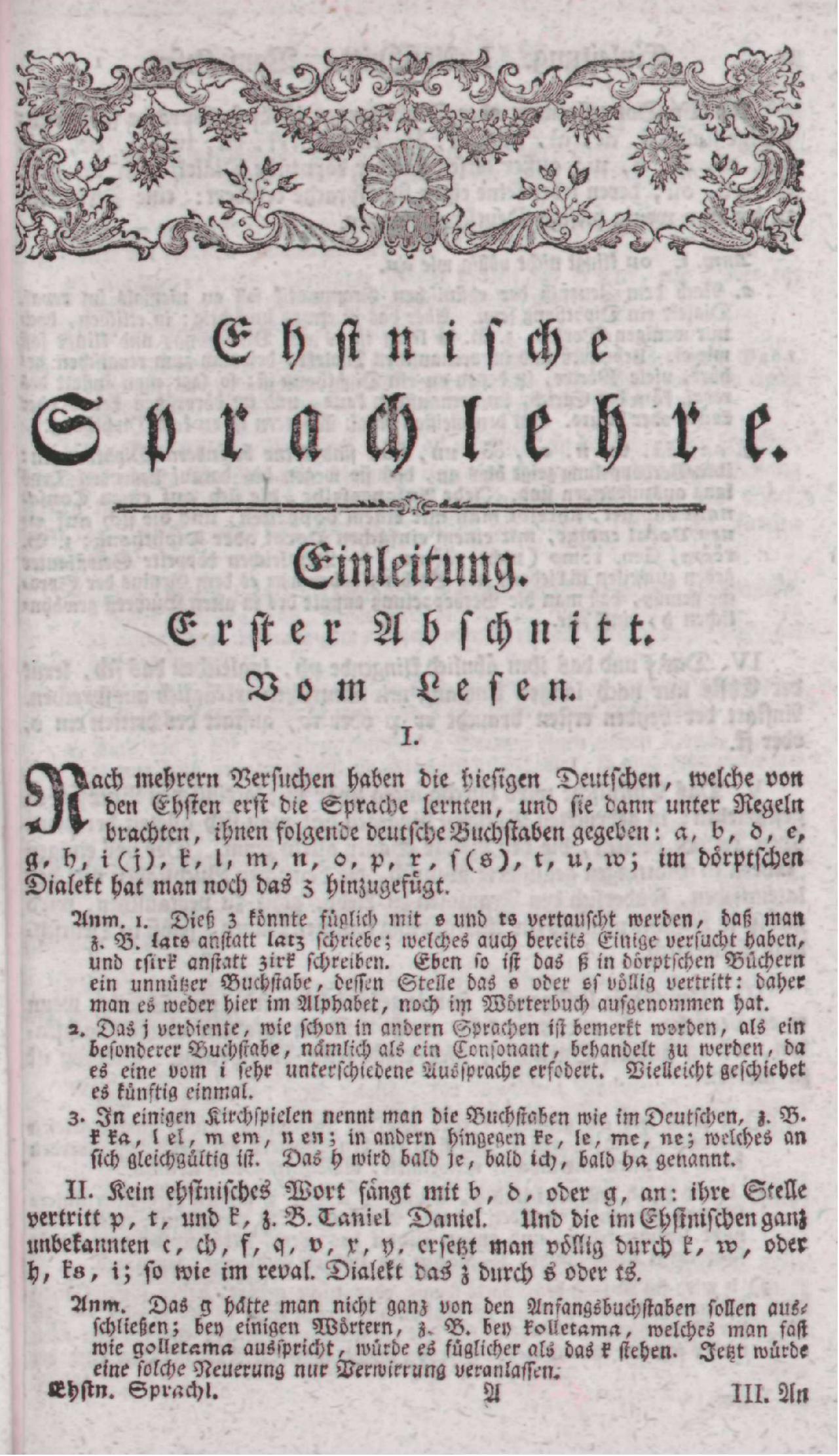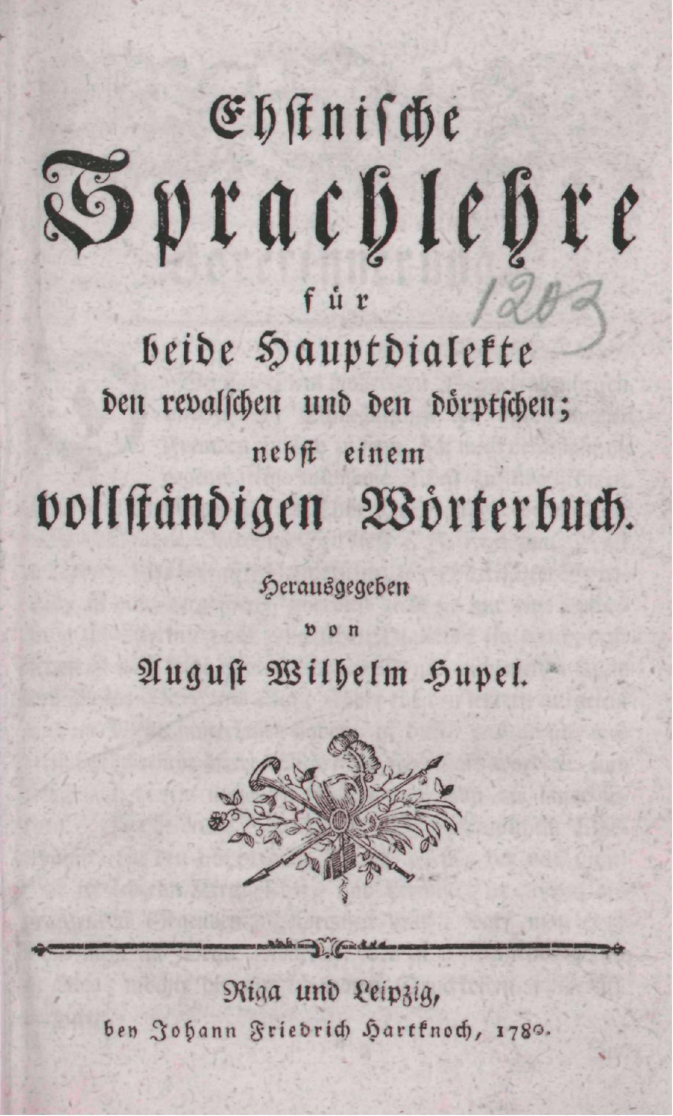 Ehstnische Sprachlehre für beide Hauptdialekte, den revalschen und doerptschen; nebst einem vollständigen Wörterbuch. Herausgegeben von August Wilhelm Hupel. Riga und Leipzig, bey Johann Friedrich Hartknoch, 1780