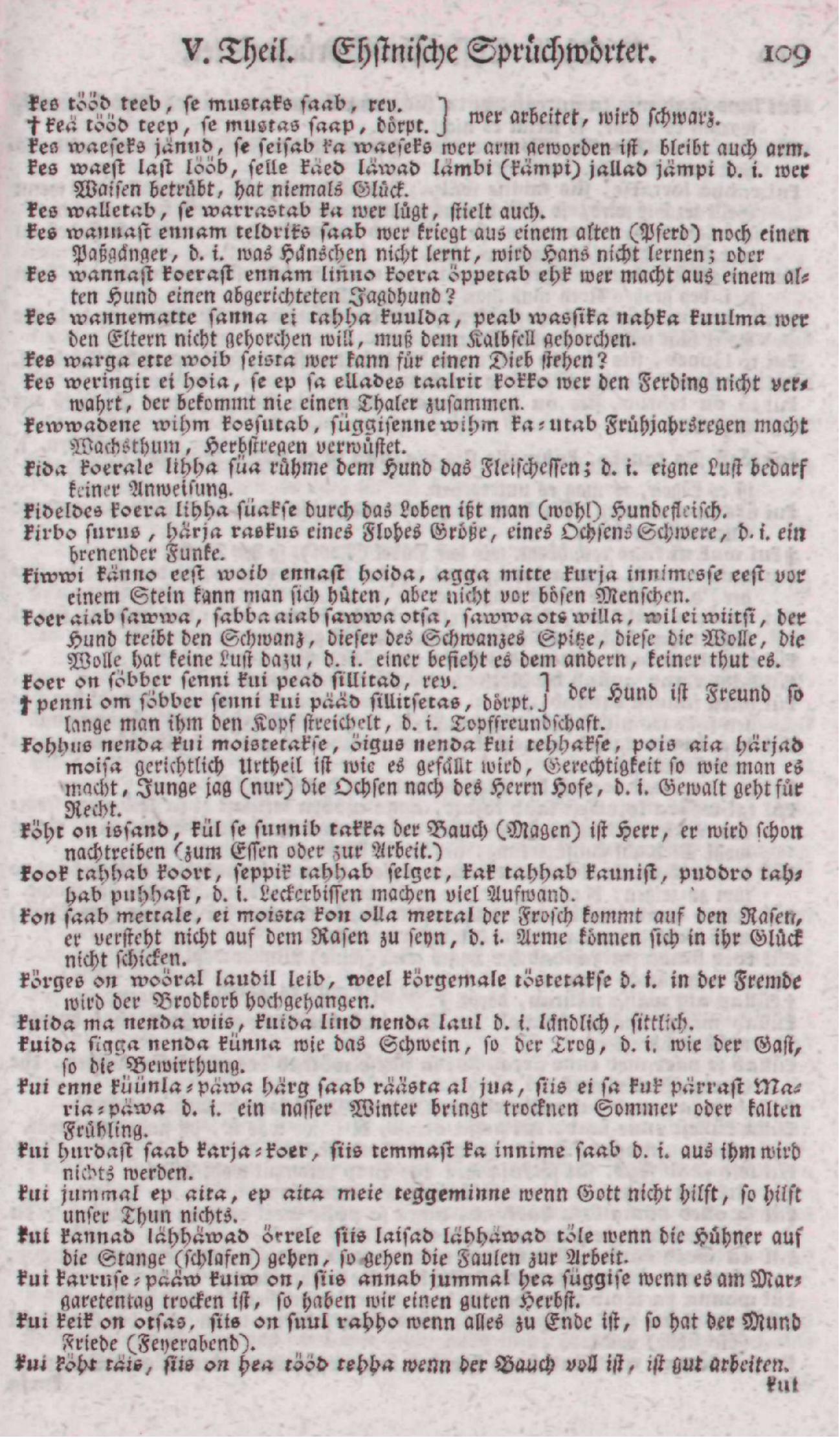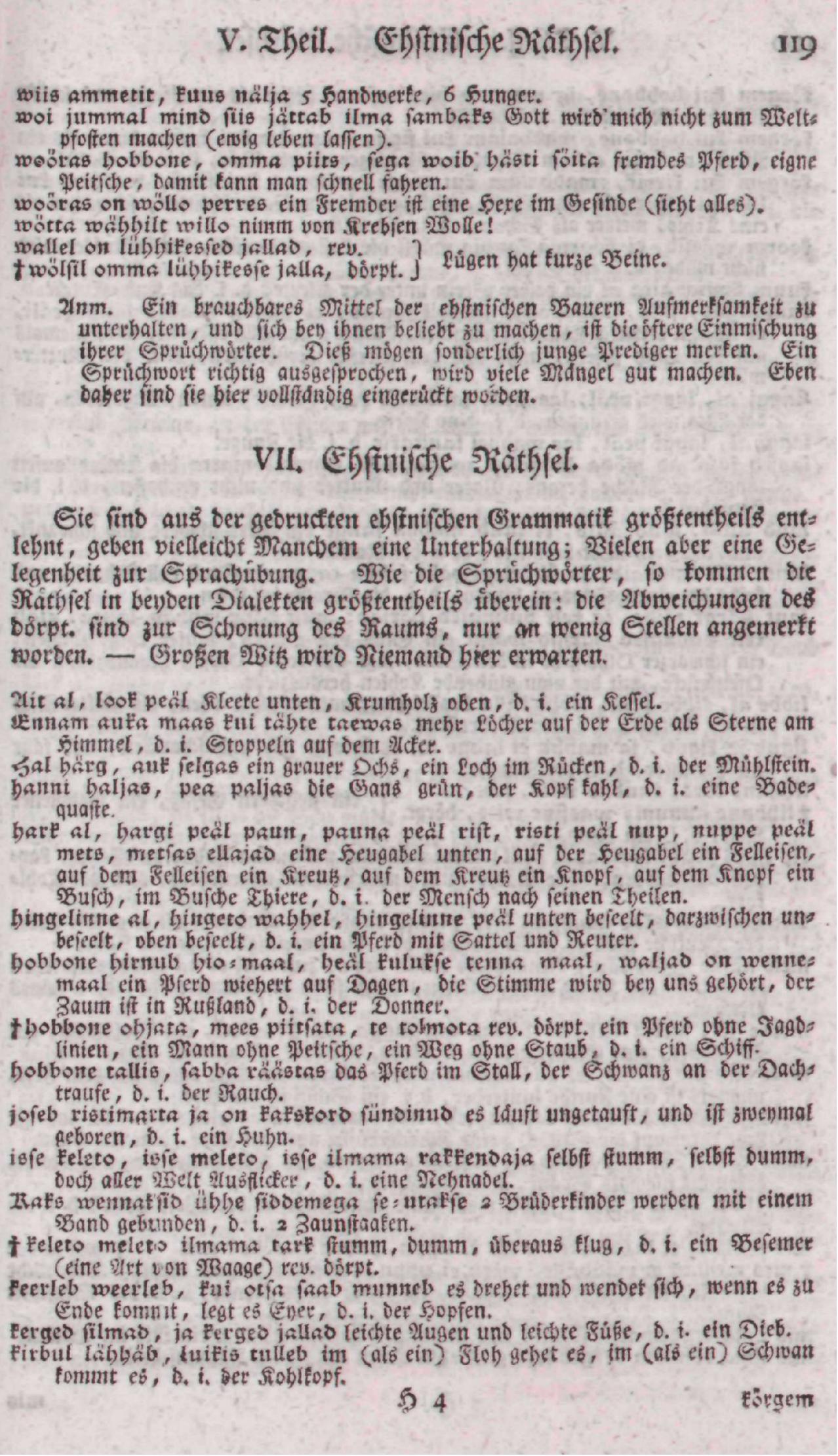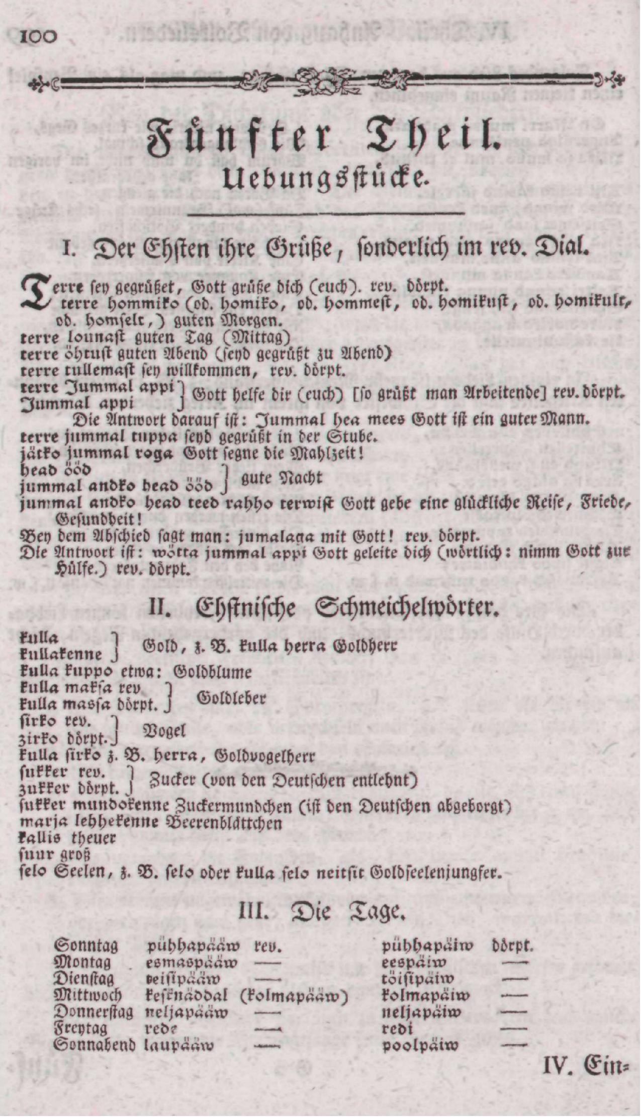 1. Ehstnische Sprachlehre: Keeletutvustus, grammatika ning A. Thor Helle grammatikast (1732) pärinevad vanasõnad, kõnekäänud ja mõistatused, kokku viies jaos.