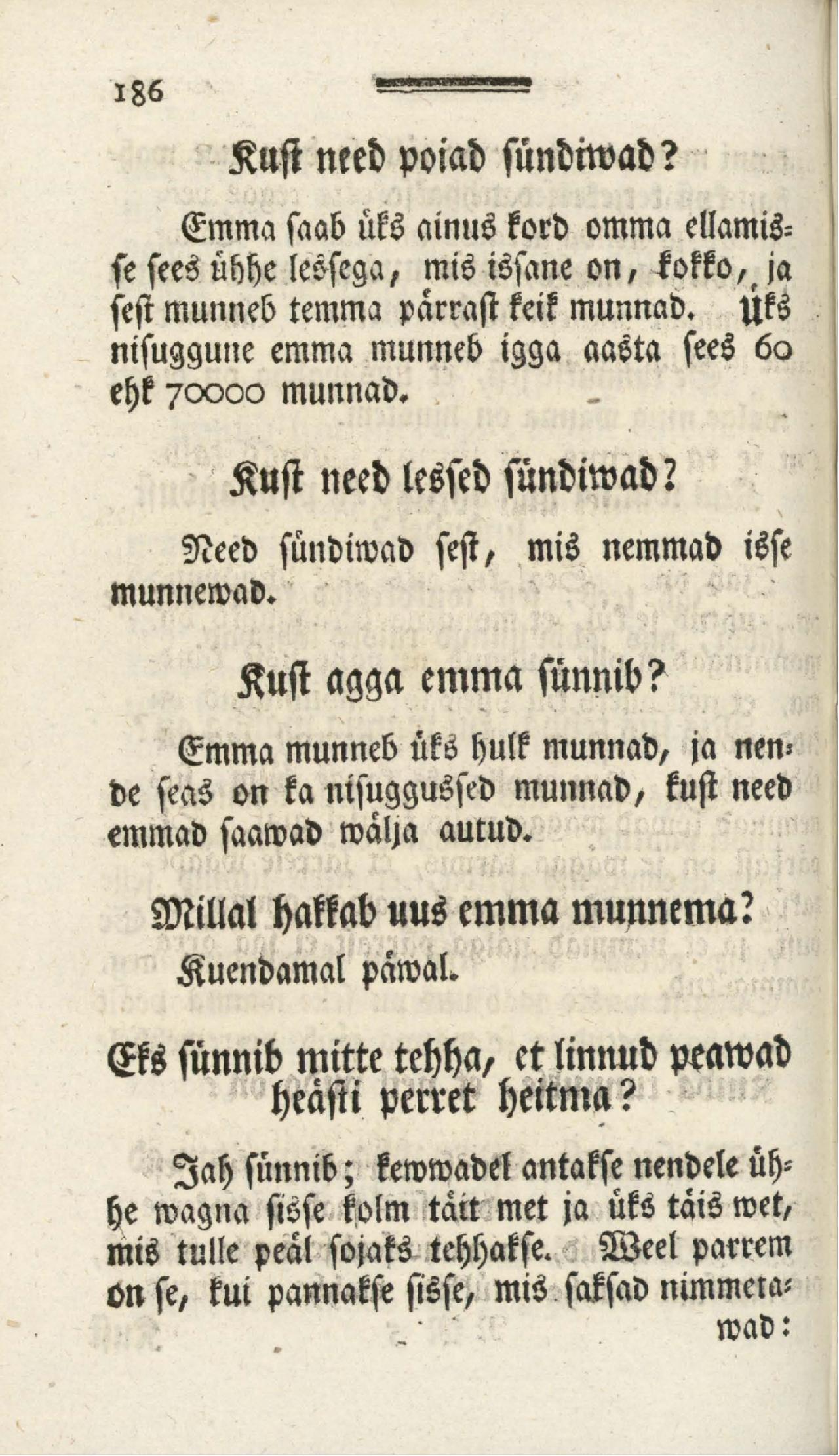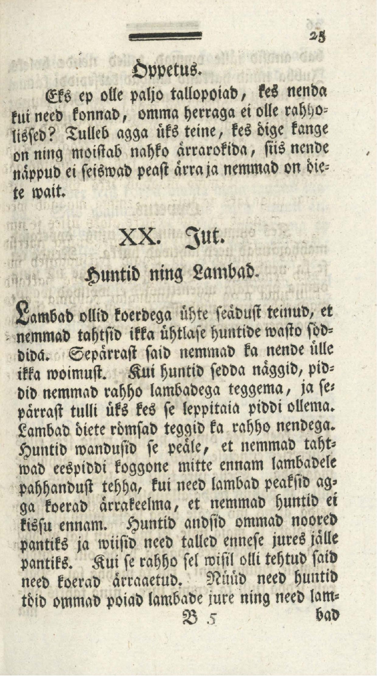 Sisaldab 51 valmi, 38 juttu. Valiku eeskujuks on olnud läti kirjaniku G. Fr. Stenderi Jaukas Pasakkas un Stahsti (1766). Need on pärit "Tuhande ja ühe öö" muinasjuttudest ja antiik-, kesk- ning renessansiaja kirjandusest. Ligi kolmandik on hiljem rahvajuttudena üles kirjutatud. Sisaldab veel 125 mõistatust A. Thor Helle grammatikast (1732) ja eraldi tiitellehtetega "Öppetus kuida keik ma rahwas woib, ilma sure waewata, linnopuud pidada, ja se läbbi rikkaks saada" ja "Öppetus kuida Ma-rahwas peab ommad ellaiad hoidma, et nemmad ei saa többiseks". Ilmunud veel 1787, 1804 ja 1838. Jutte ja öpetusi on hiljem korduvalt trükitud. (ESTER, Märkused )