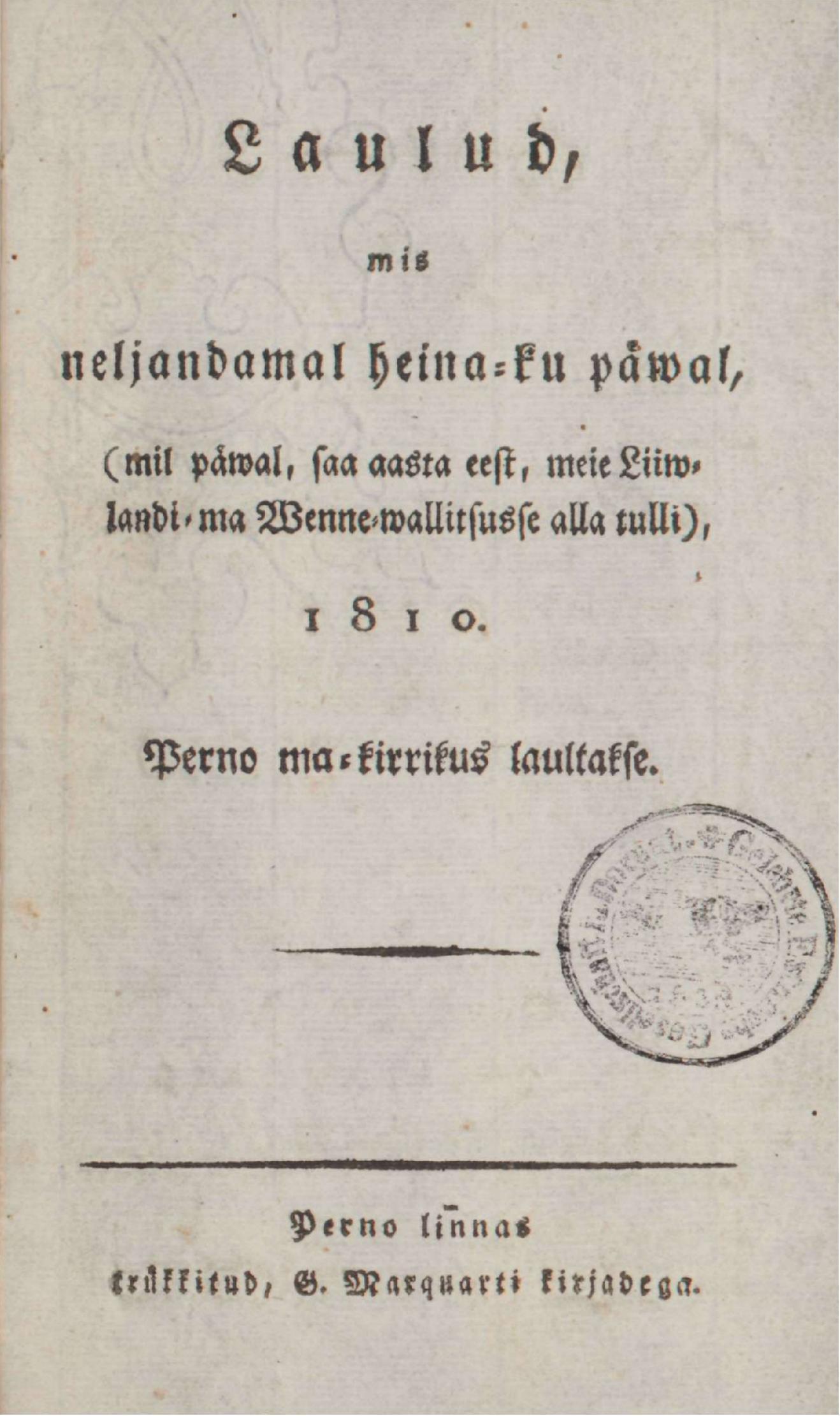 Laulud, mis neljandamal heina-ku päwal ... Pärnu trükikoda 1810
