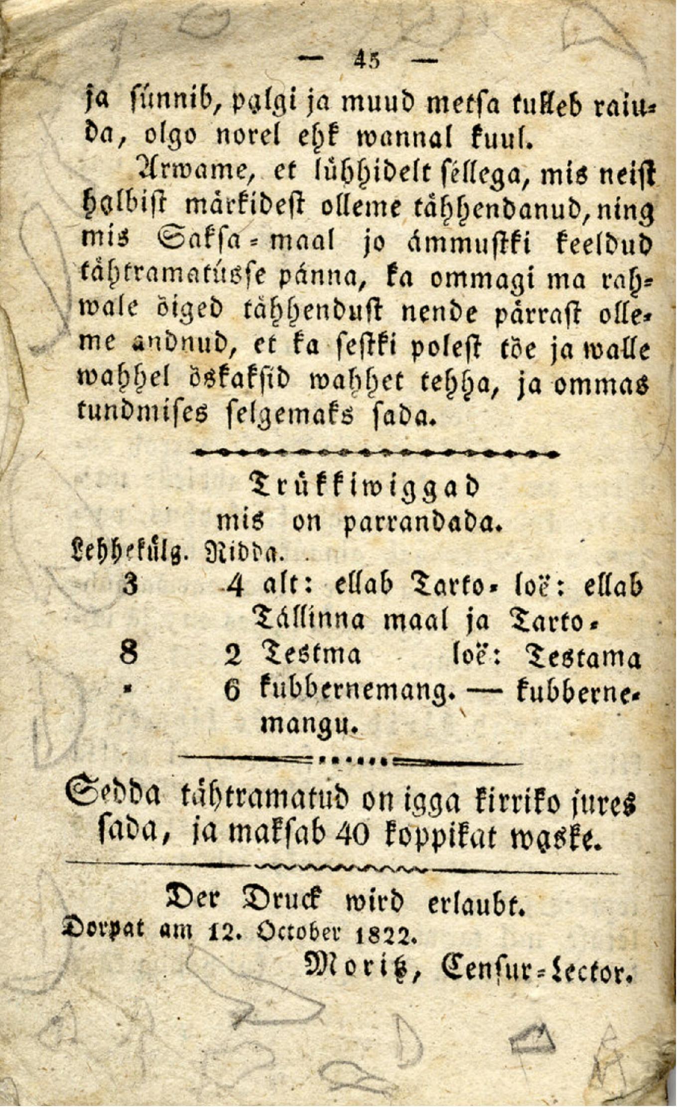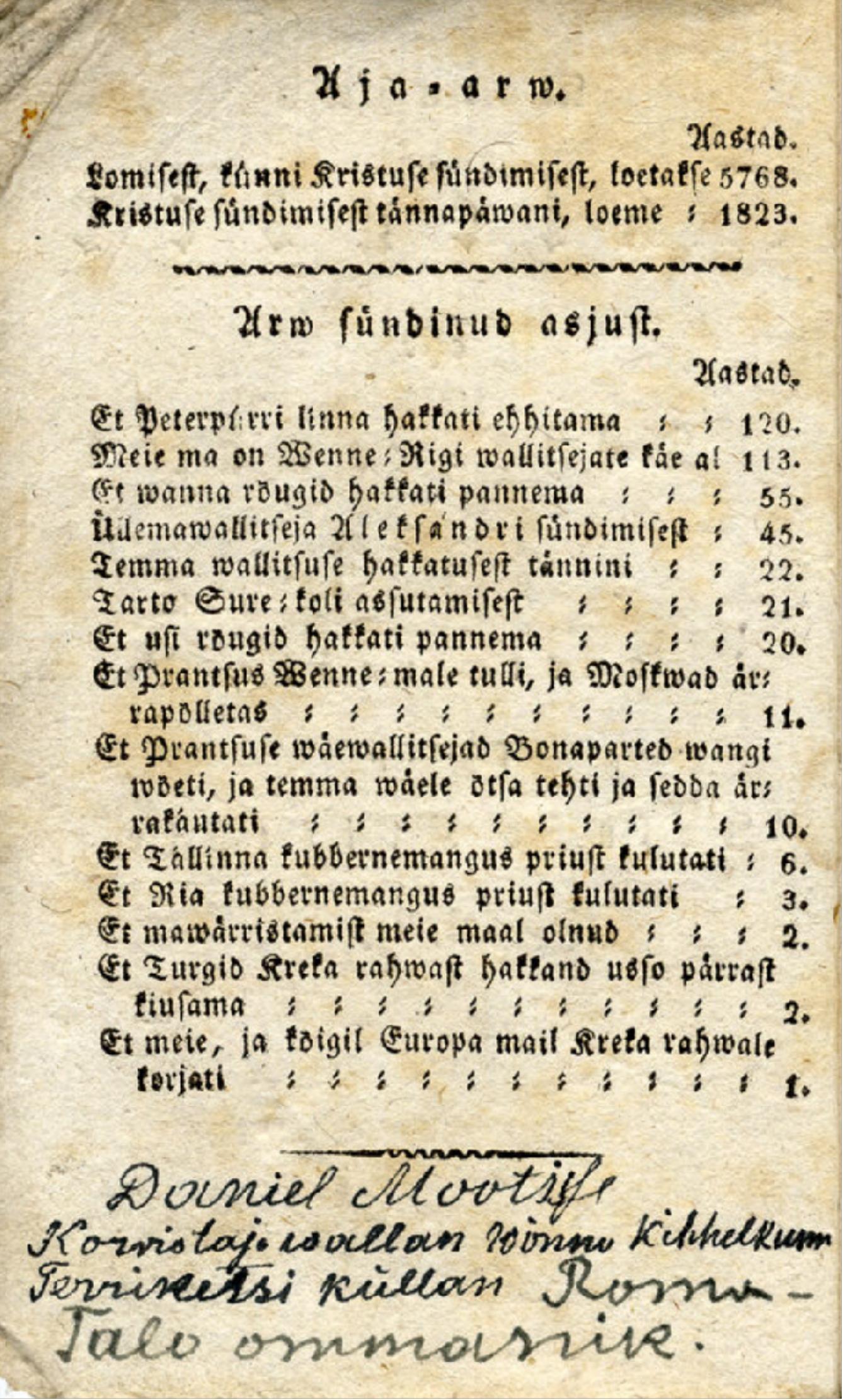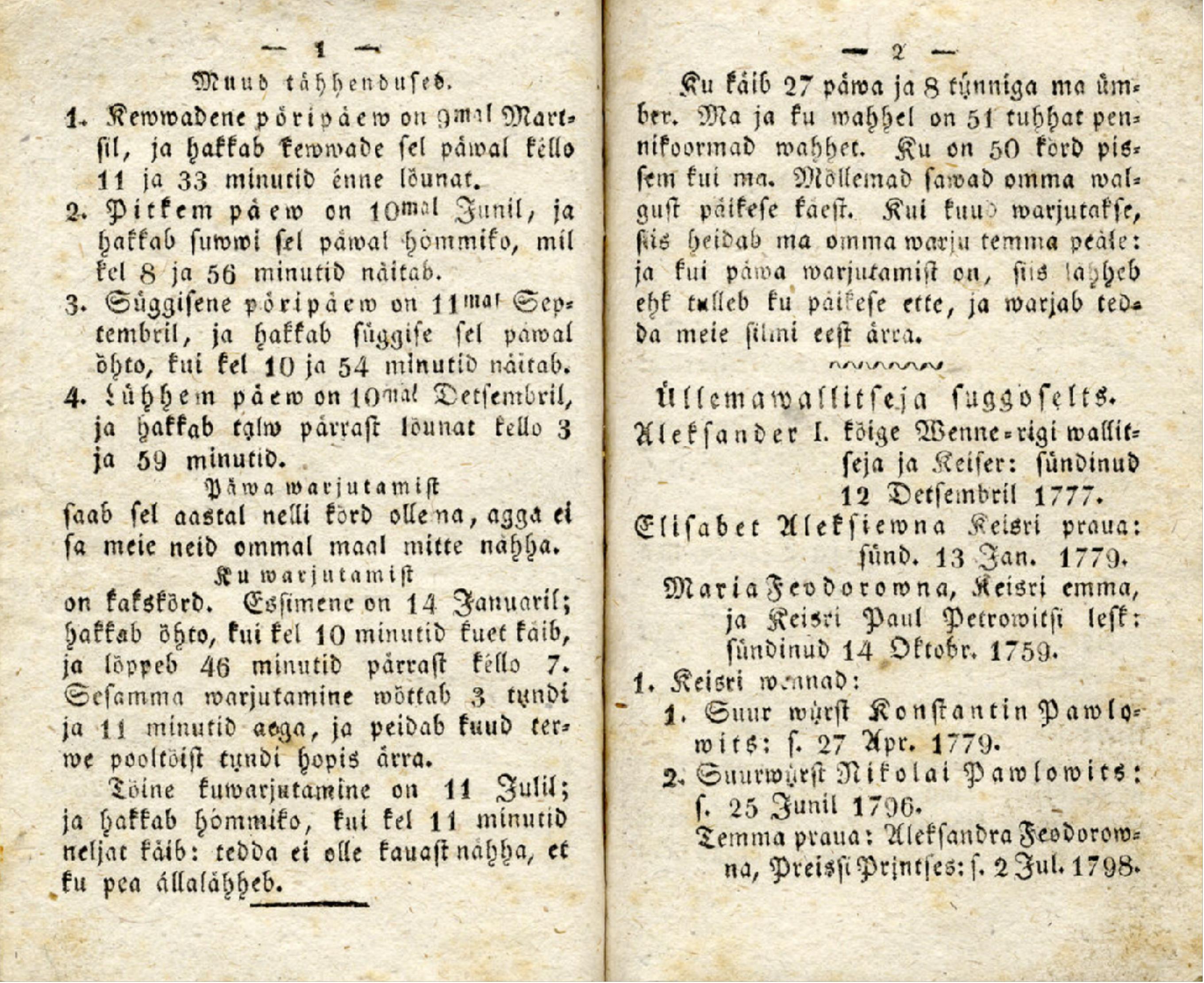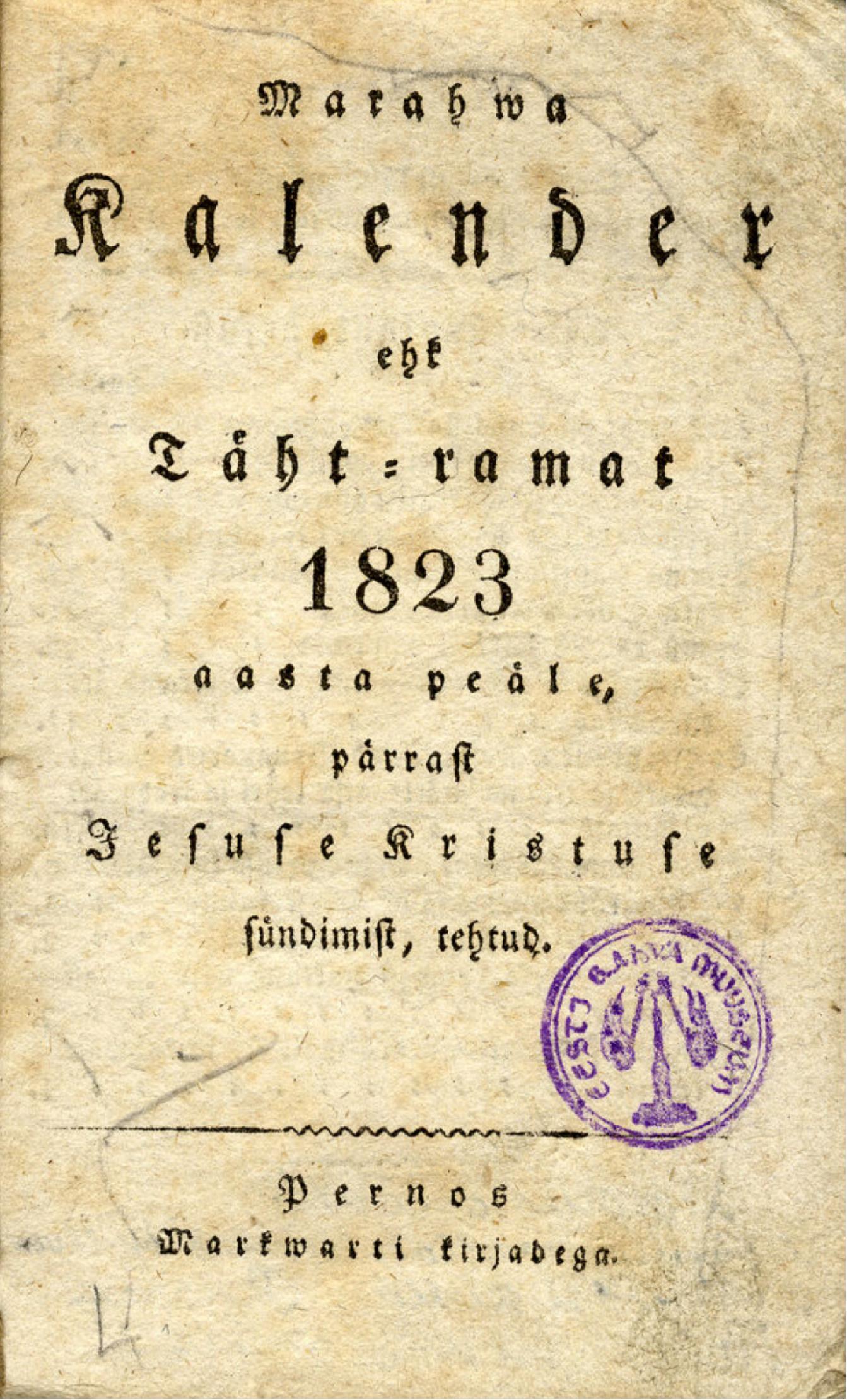 Neljanda eestikeelse kalendrisarja ( O. W. Masingu kalender) esimene kalender - 1822