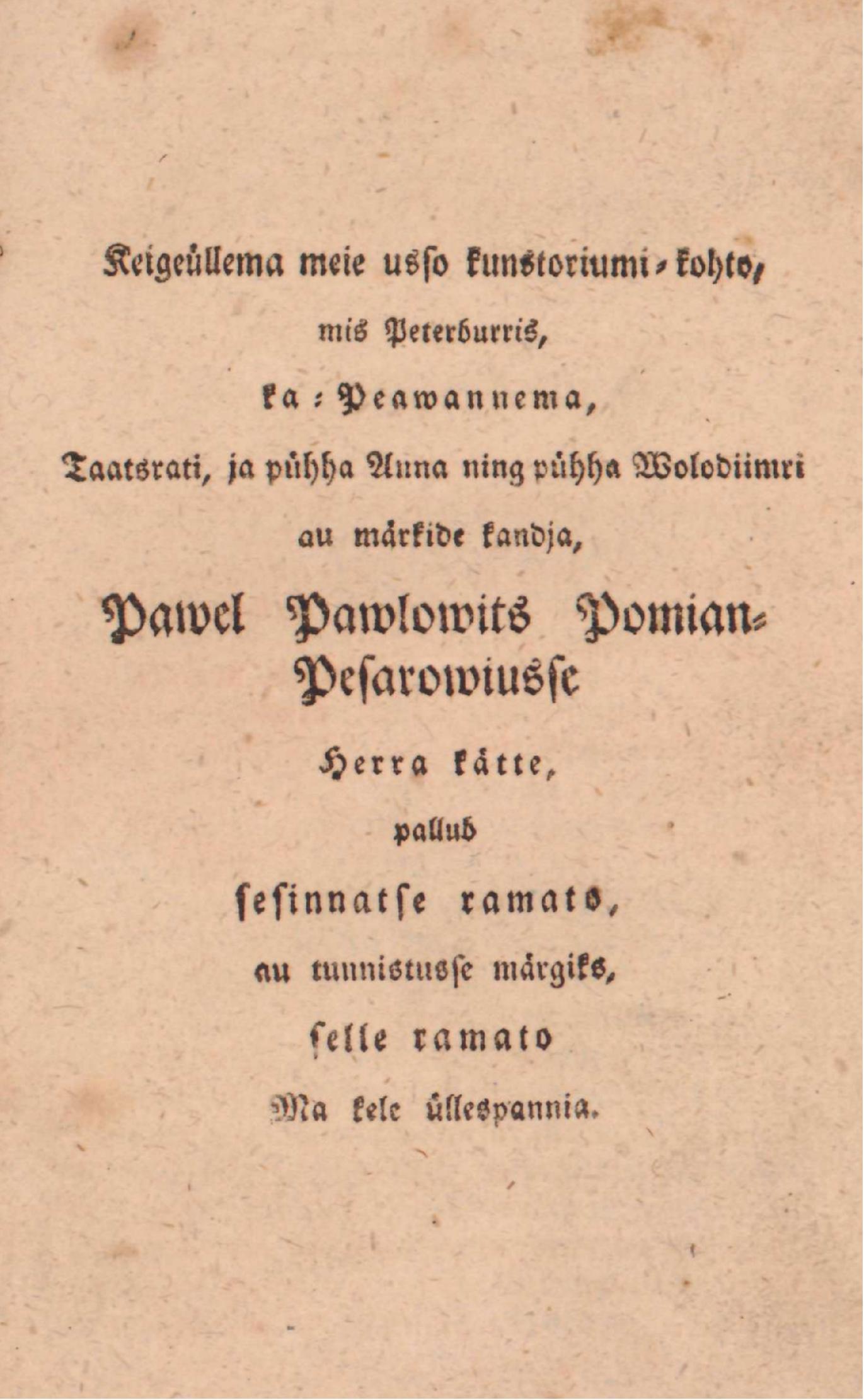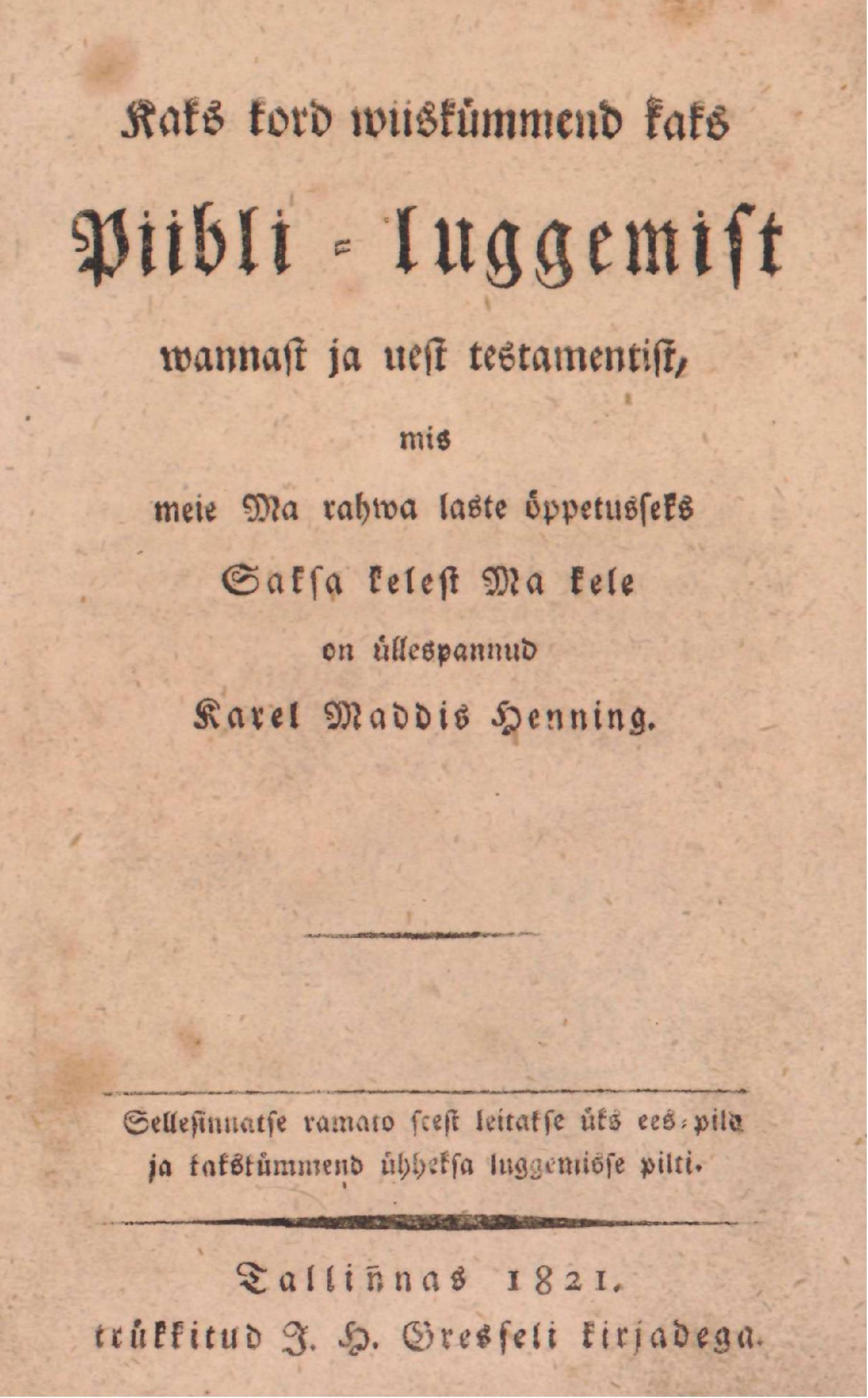 Ilmunud: Tallinn, s.n., 1821 (Tallinn, J. H. Gressel)