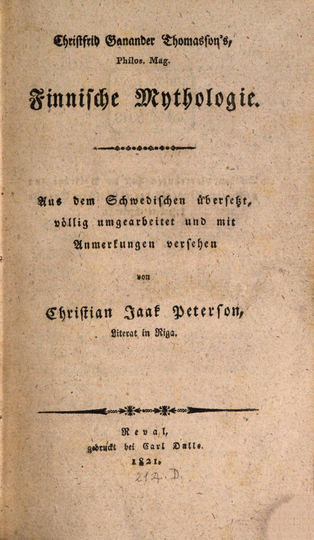 Ajakirja XIV vihikus ilmus Petersoni suurteos, Christfried Gananderi “Soome mütoloogia”.