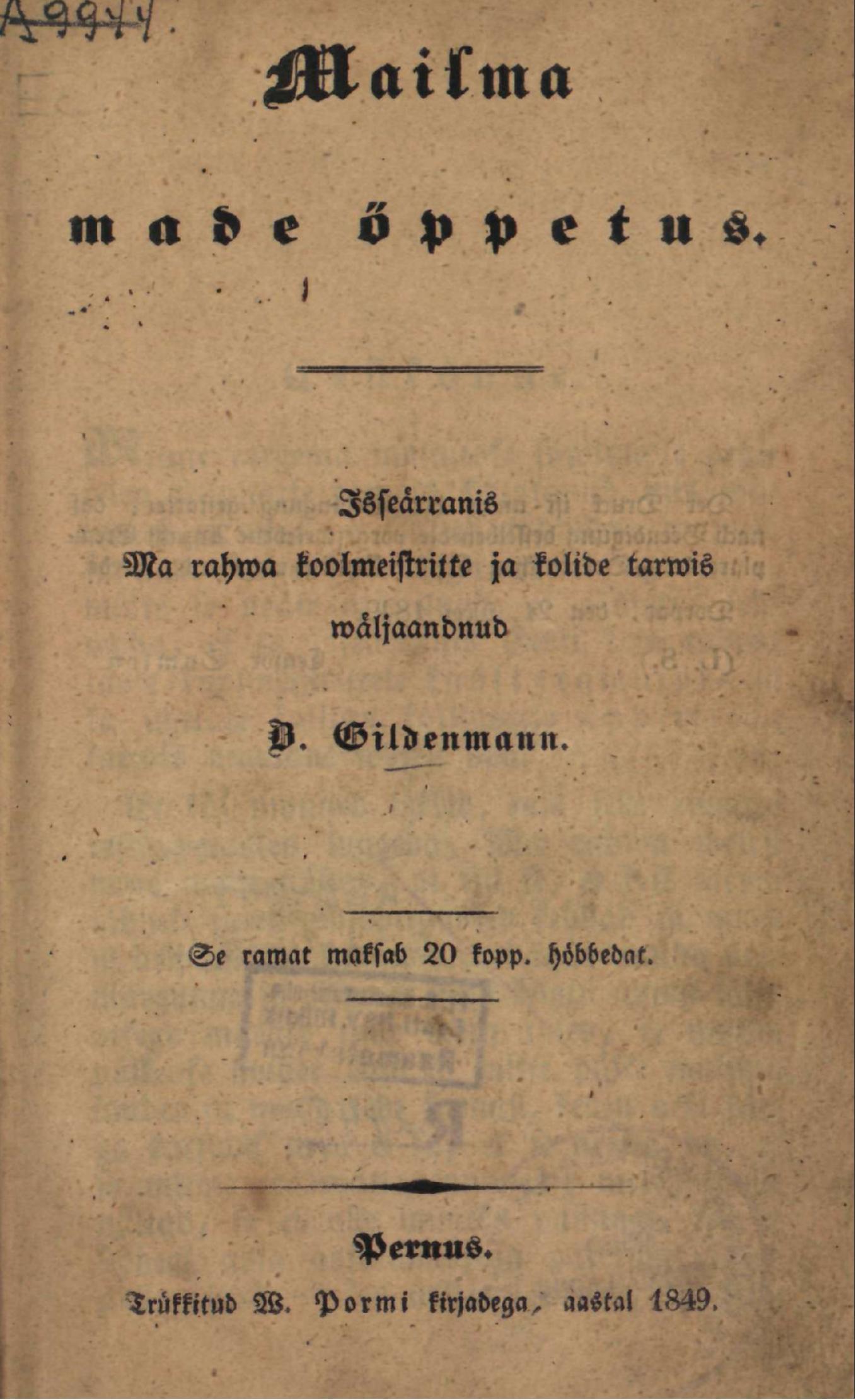 Esimene eestikeelne geograafiaõpik - wäljaandnud Berend Gildenmann 1849