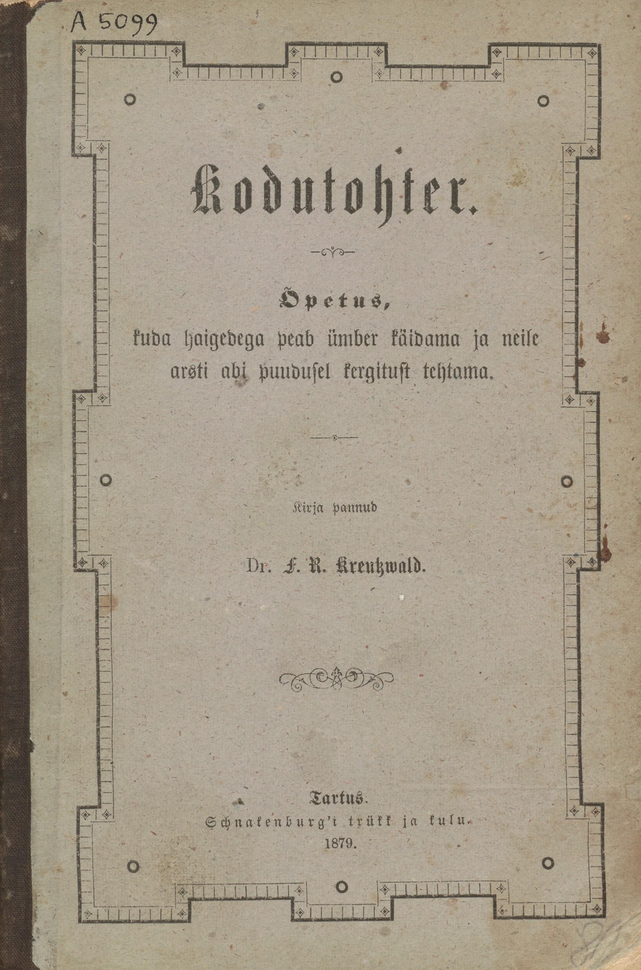 Kodutohter. Õpetus, kuda haigedega peab ümber käidama ja neile arsti abi puudusel kergitust tehtama.