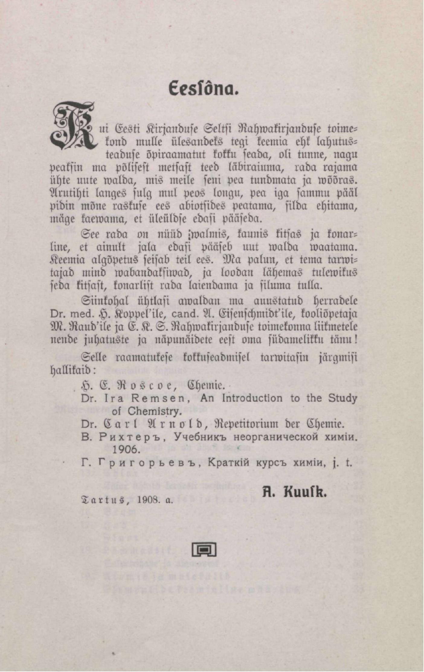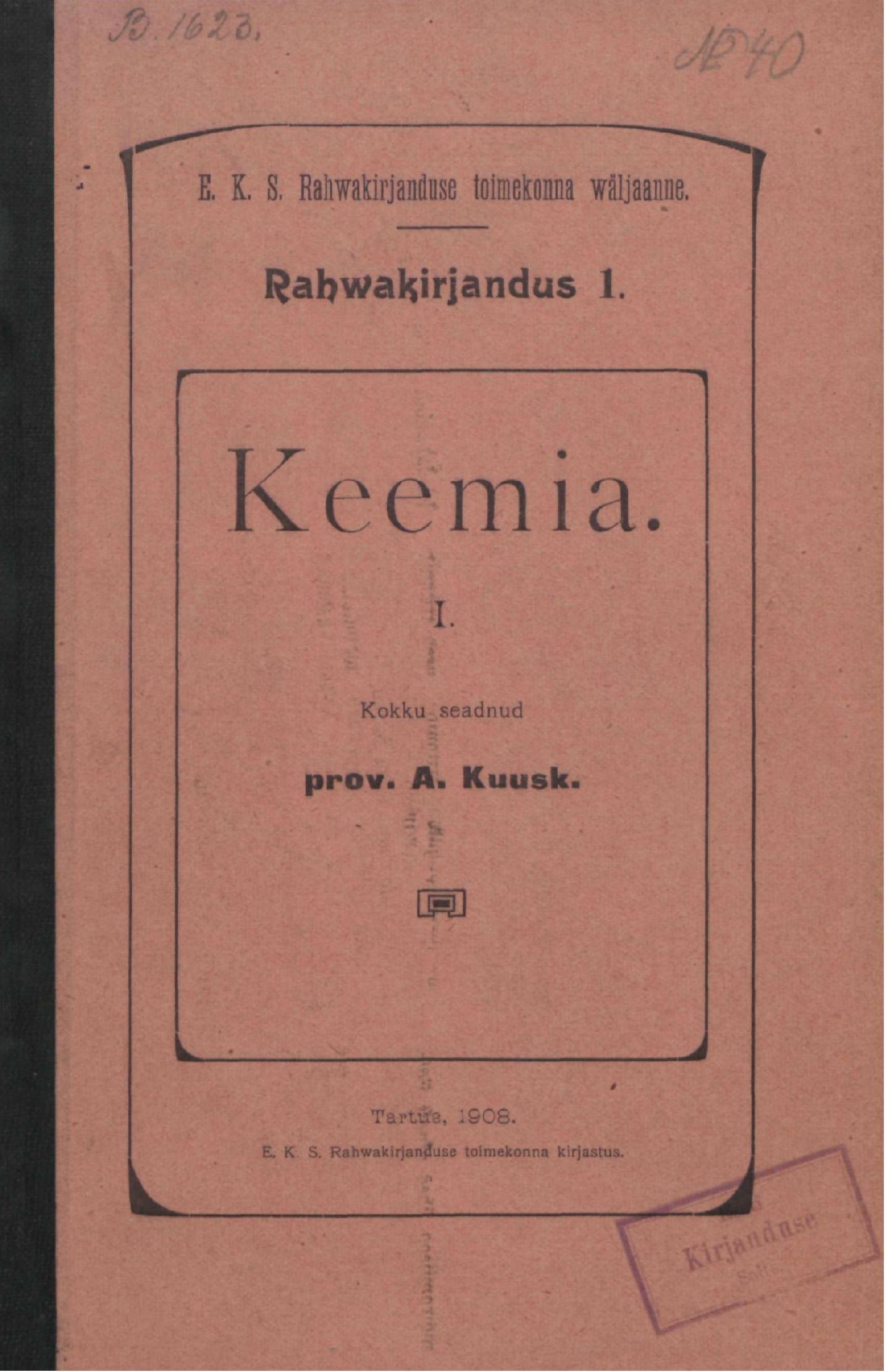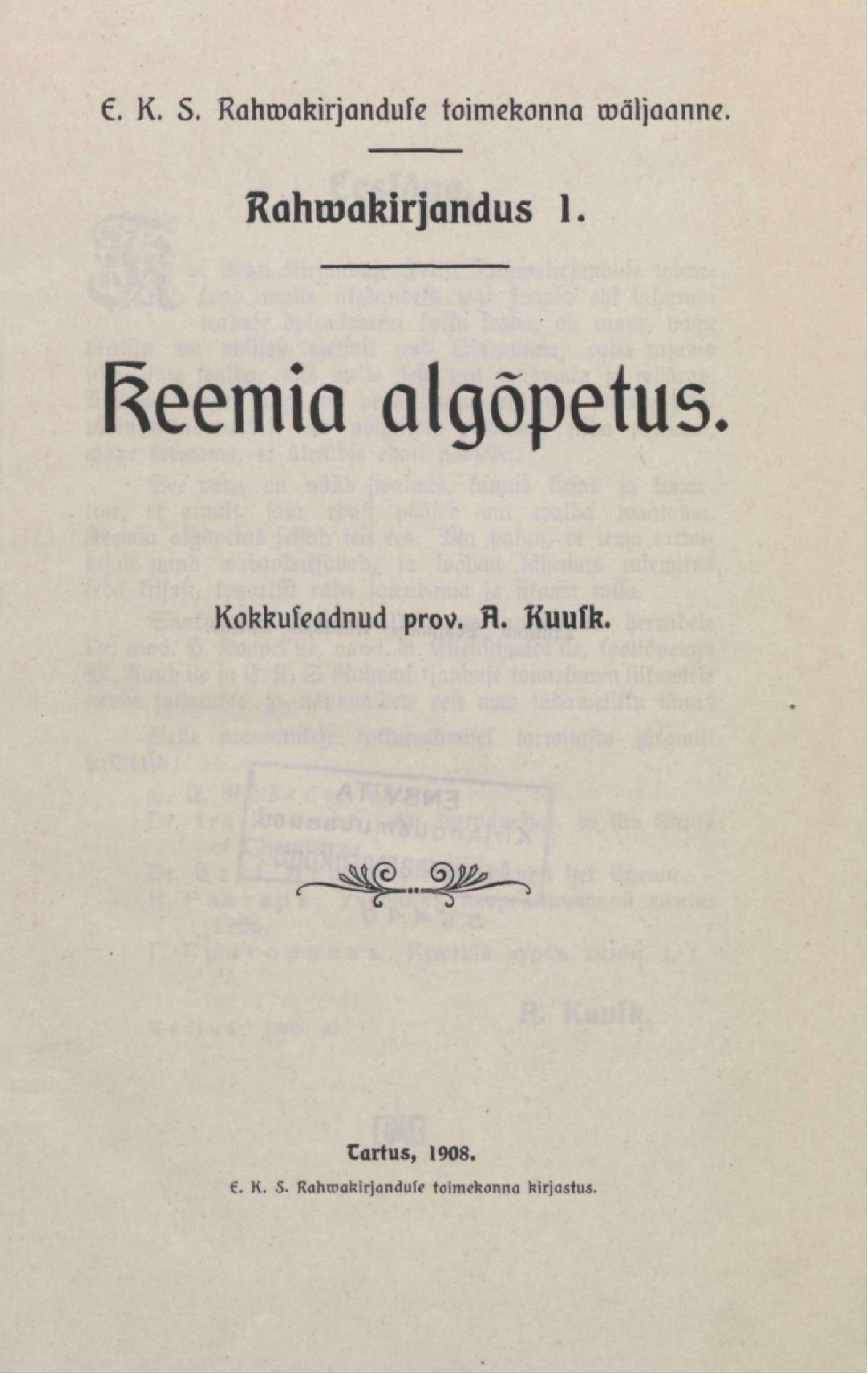 Esimene eestikeelne keemiaõpik - Keemia algõpetus proviisor Andres Kuuselt 1908