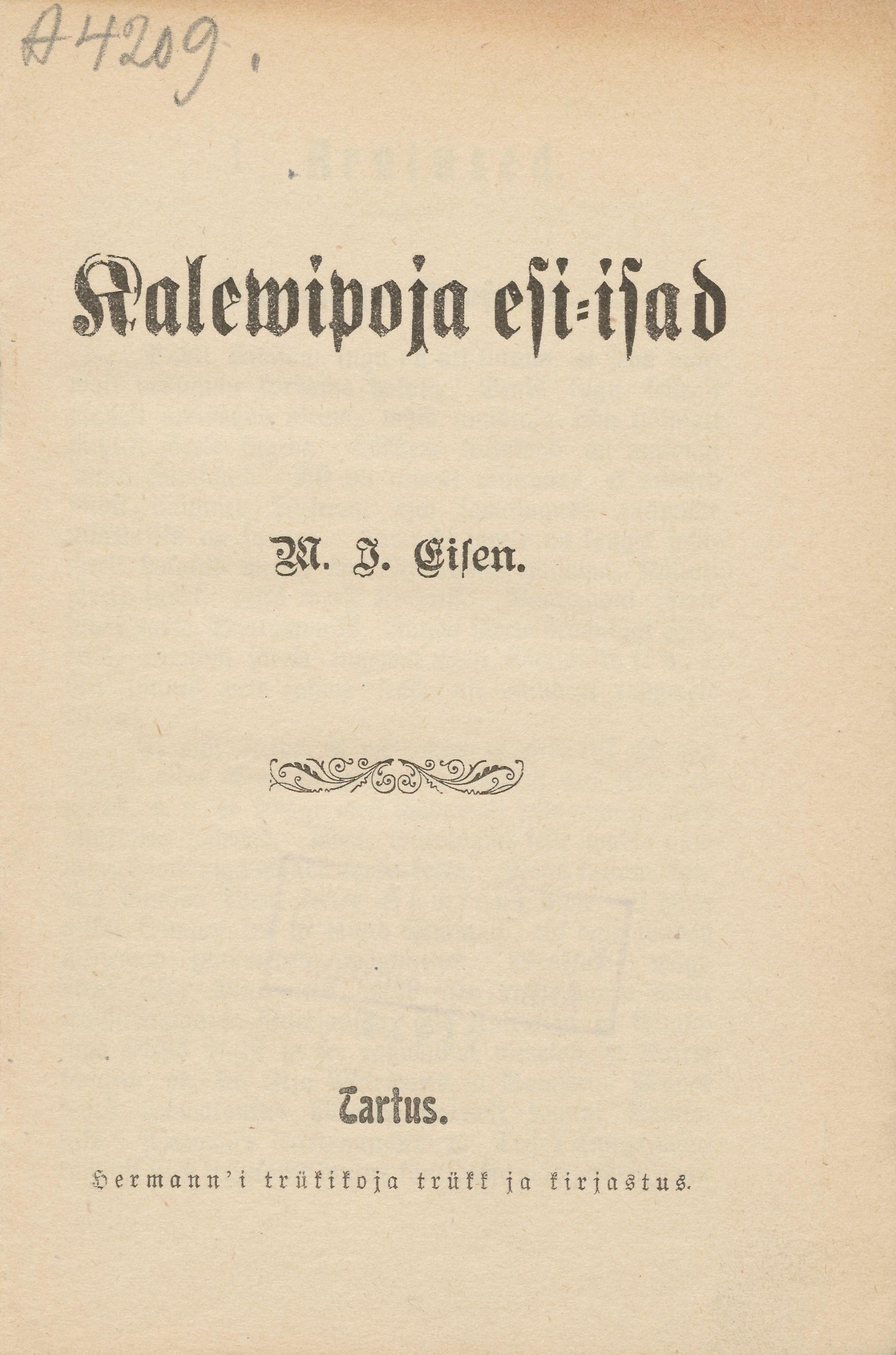 Jutukogumikus „Kalevipoja esi-isad“ (1910) on kokku koondatud lood suure jõuga meestest. Raamatu 25 muinasjuttu jagunevad põhiliselt kolme imemuinasjututüübi vahel, milleks on „Röövitud kuningatütred“ (ATU 301), „Tugev Mats“ (ATU 650A) ning „Vastaseotsija“ (ATU 650B). Lugemist väärib Eiseni arutlus vägimeestest eri rahvastel (Soomes, Lapimaal, Skandinaavias, Leedus, Venemaal) ning nende erinevatest esinemiskujudest (Kalevipoeg, vastaseotsija, kolm venda, Tugev Mats). Eisen lähtub antud teemat käsitledes nii müütilistest kui muinasjutulistest tegelastest, püüdmata neid žanriliselt eristada.
