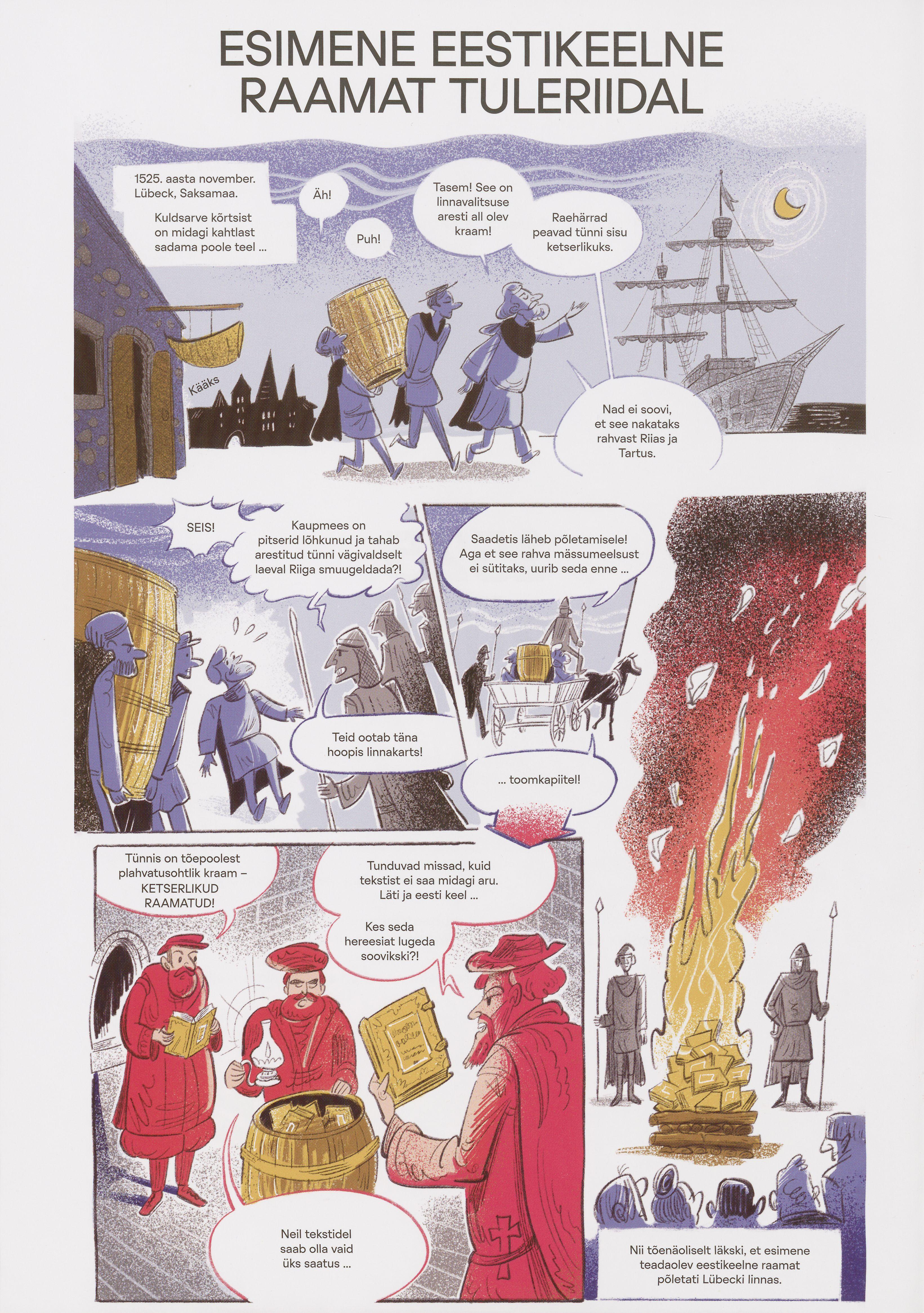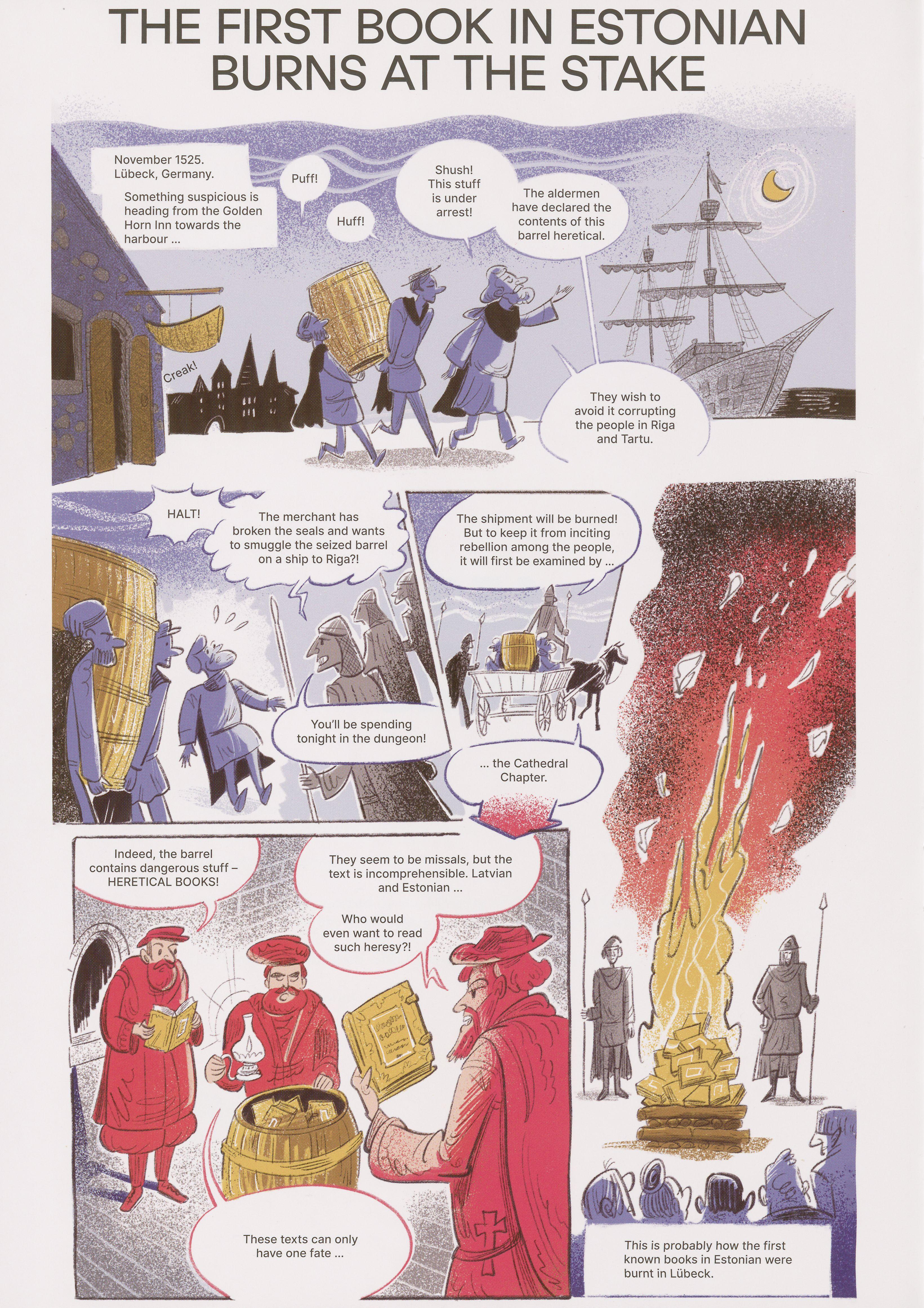 Koomiksid on inspireeritud Eesti ja Läti rahvusraamatukogude ühisest artiklikogumikust See esimene raamat : 500 aastat ühist kirjakultuuri , mis ilmus mais 2025. Vaata ka raamatu postitust.