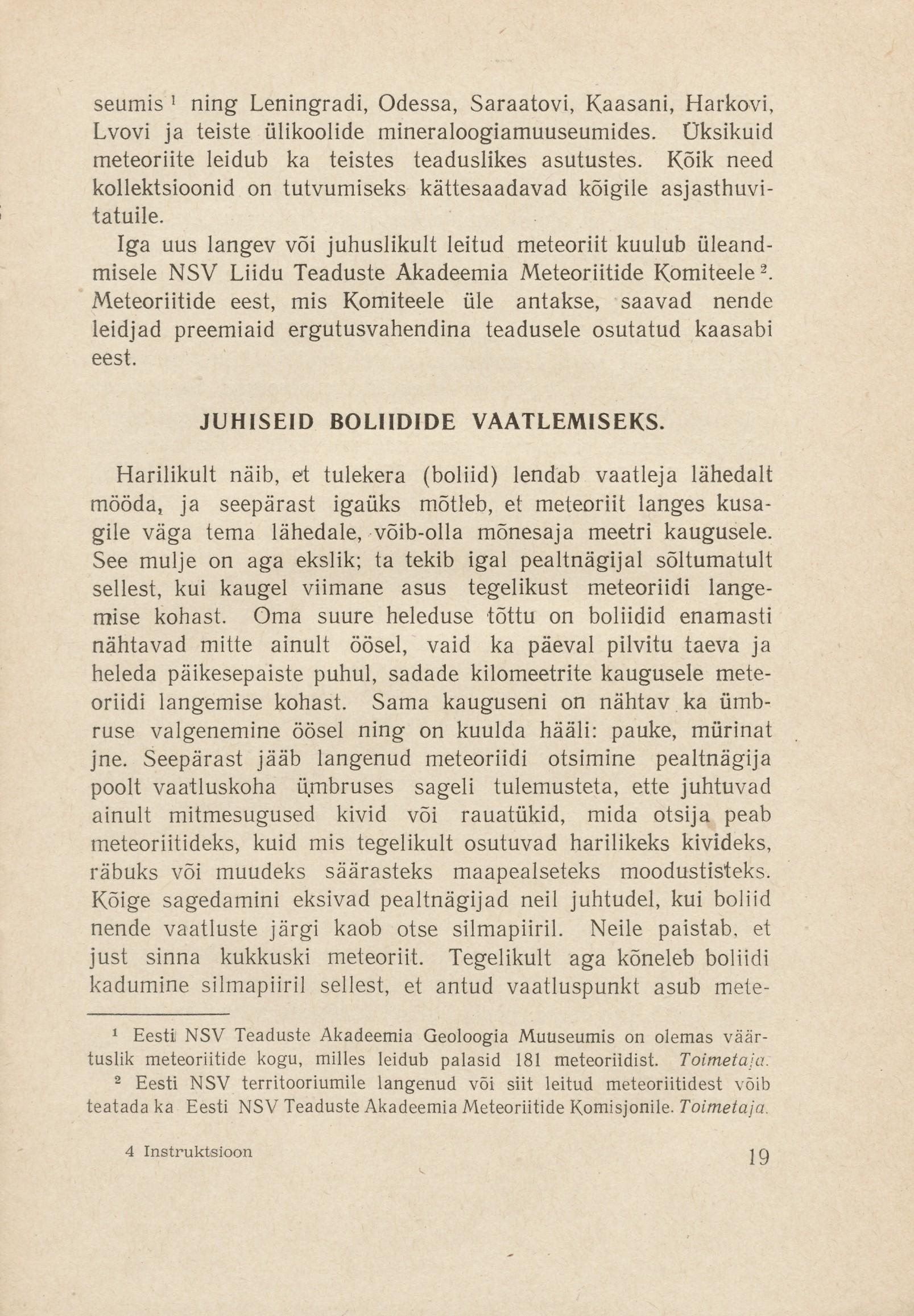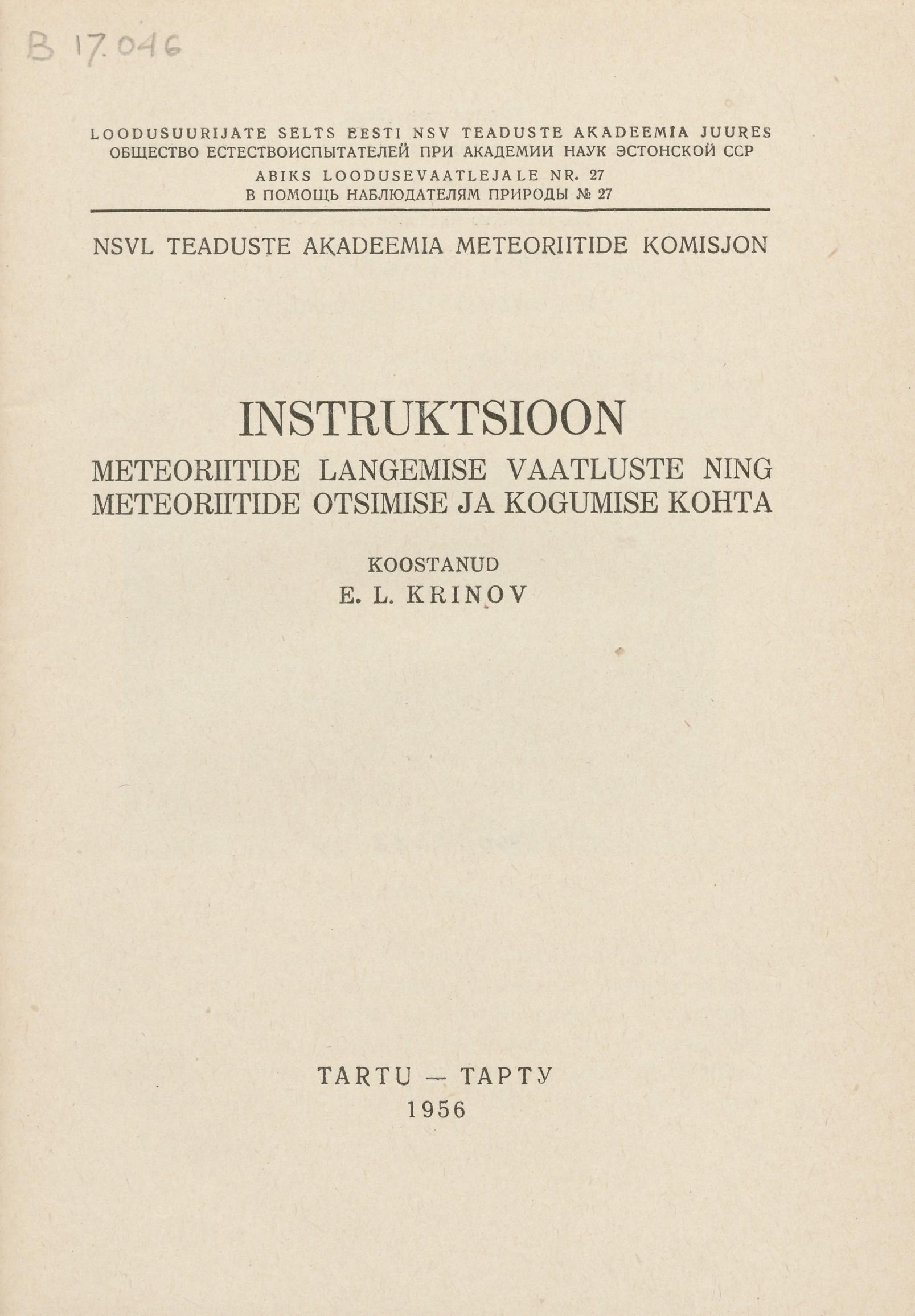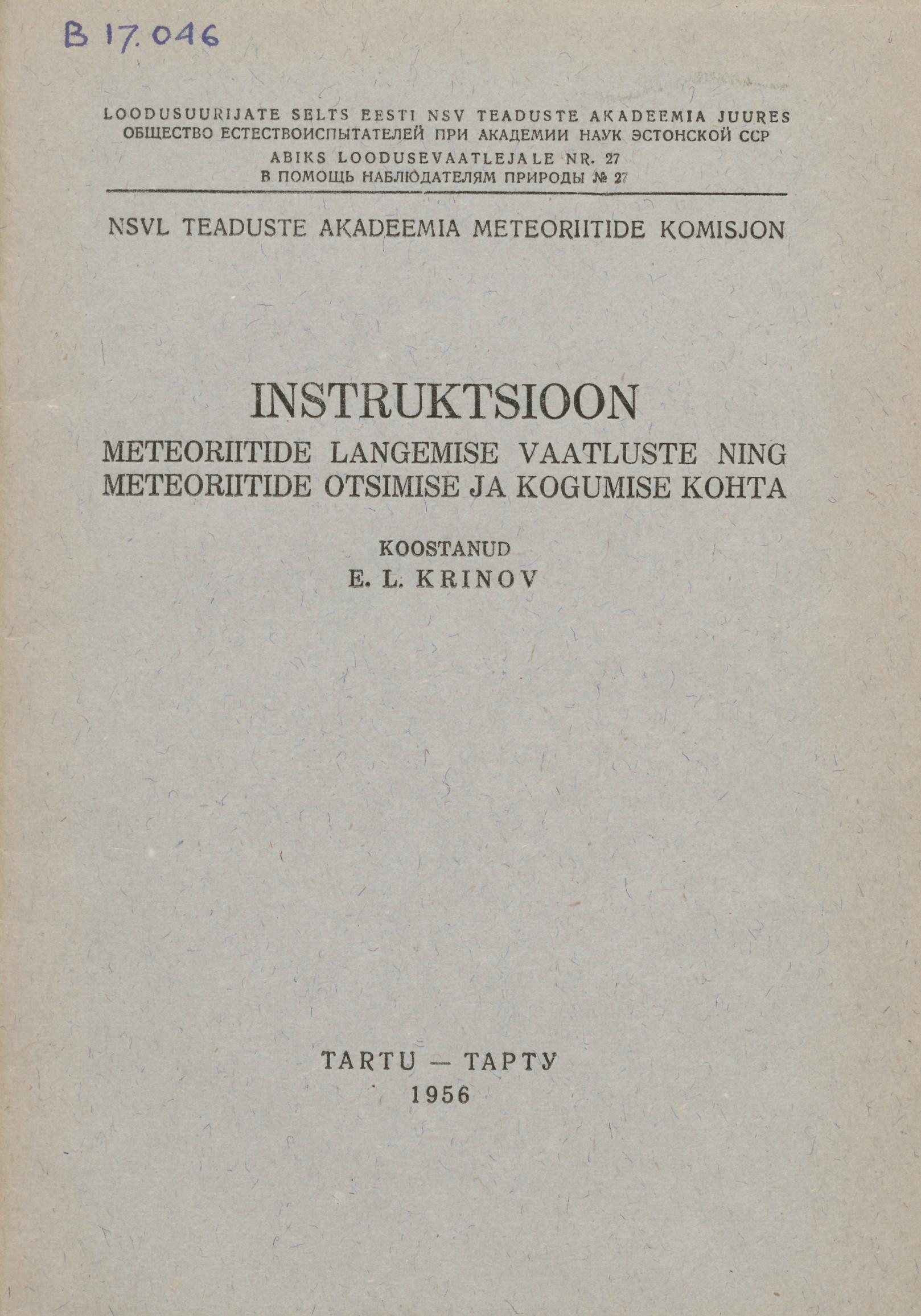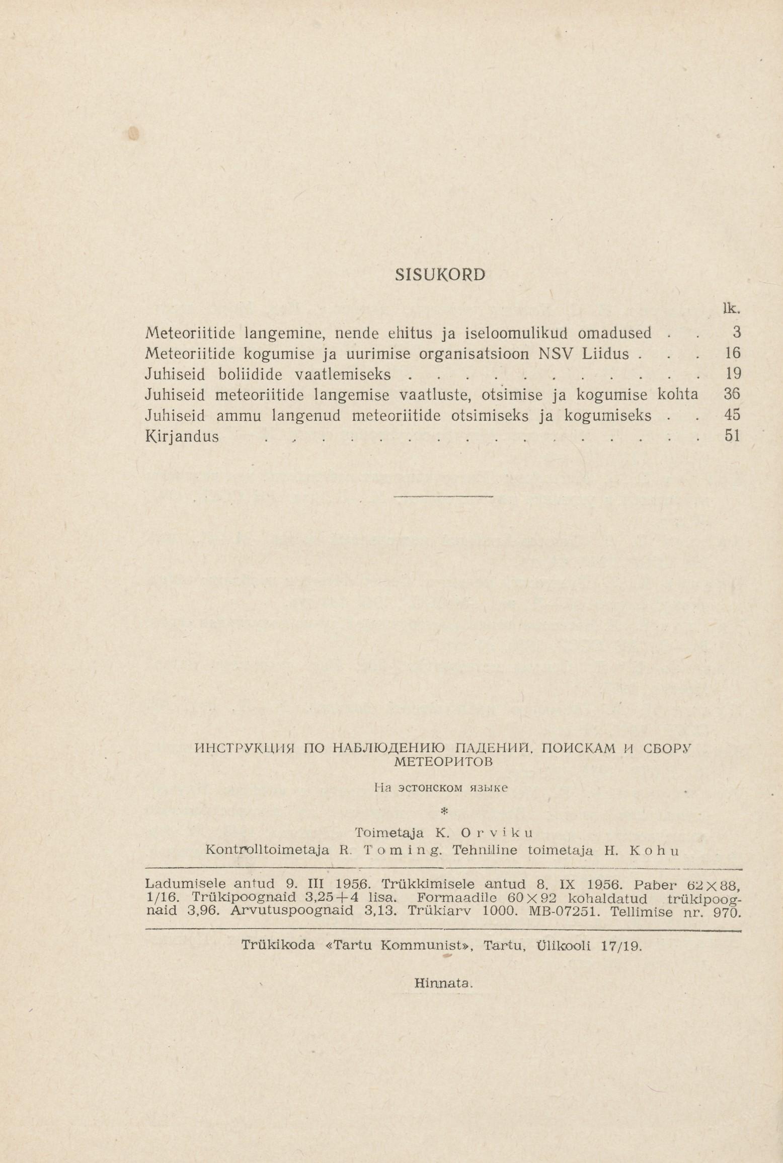 Instruktsioon meteoriitide langemise vaatluste ning meteoriitide otsimise ja kogumise kohta - 1956