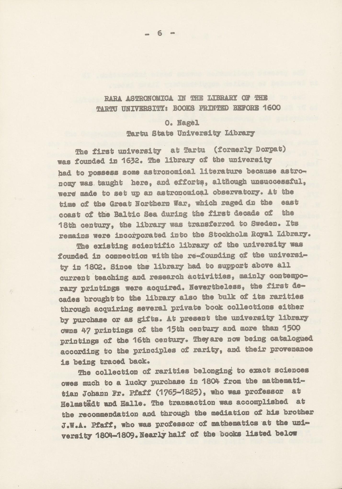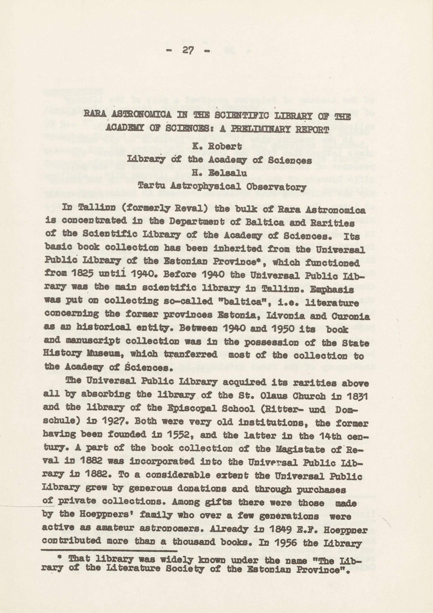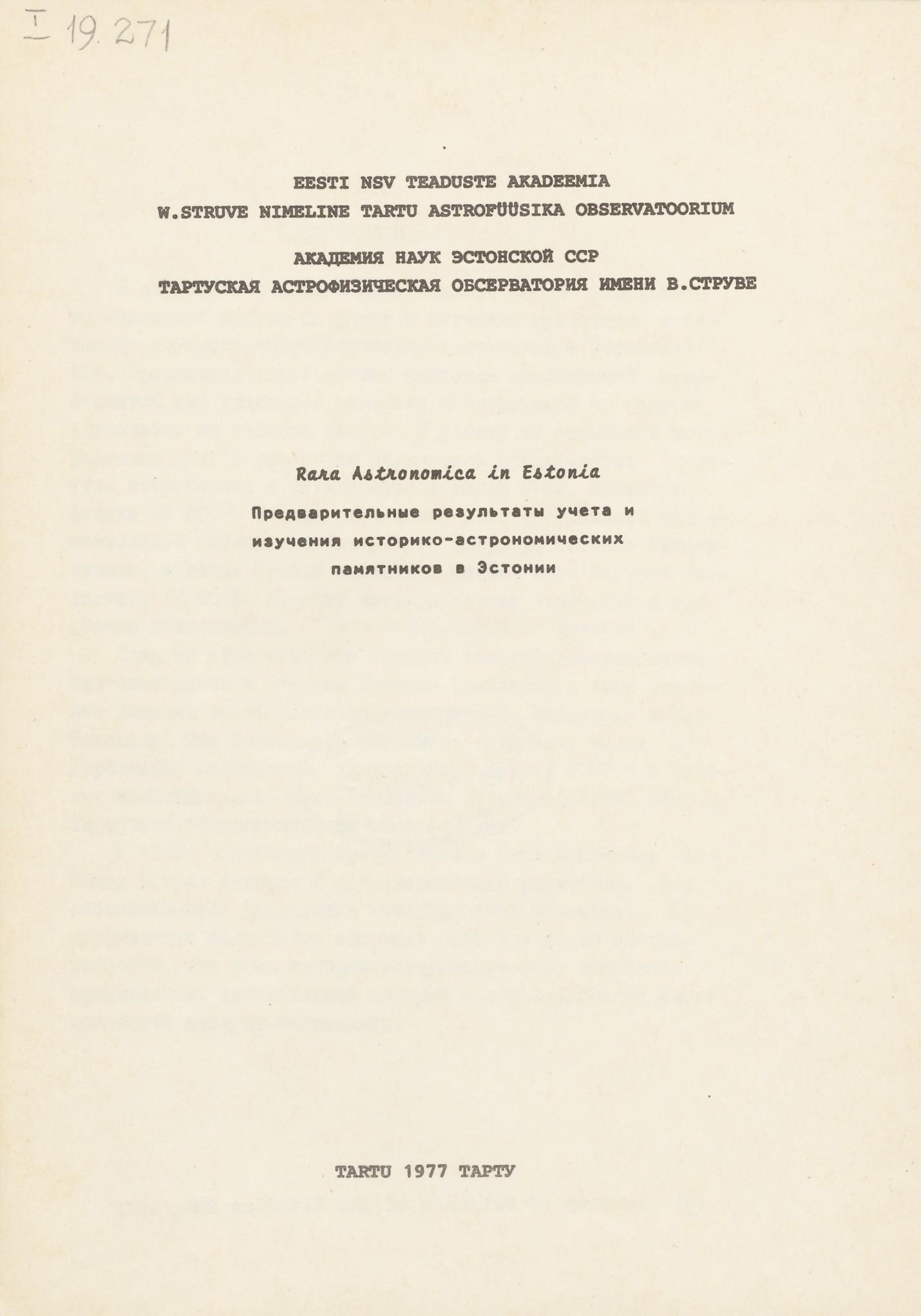 Astronoomiaalased rariteetsed raamatud, käsikirjad ja kirjad TÜ, AAI, TA raamatukogudes. Raamatuke on ingliskeelne, kohustuslikud venekeelsed lühikokkuvõtted olid lahtiste lehtedena raamatu vahel.