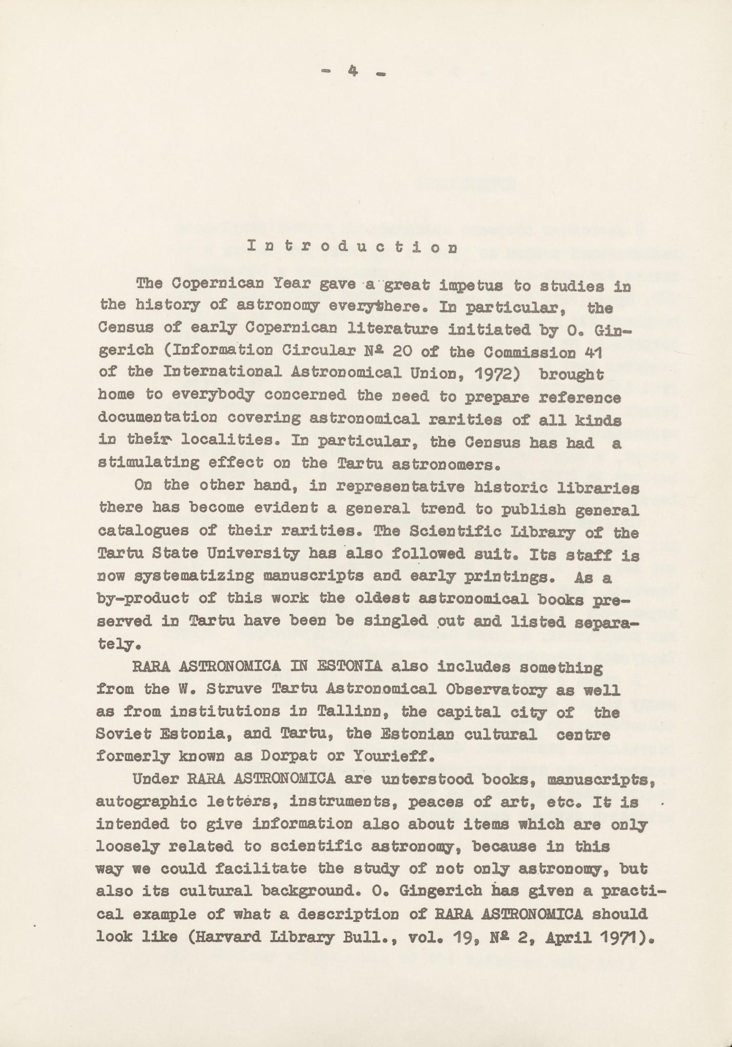 Ajendiks oli nn Koperniku aasta (500 aastat, 1973) ja Owen Gingerichi avaldatud ringkiri, millest hiljem kasvas raamat An Annotated Census of Copernicus' De revolutionibus (Nuremberg, 1543 and Basel, 1566). Tekkis huvi üle vaadata, ühtlustada ja välja anda nimestik Eesti raamatukogudes leiduvast materjalist. 1980ndal aastal avaldati täiendus Rara Astronomica in Estonia, Supplementum.