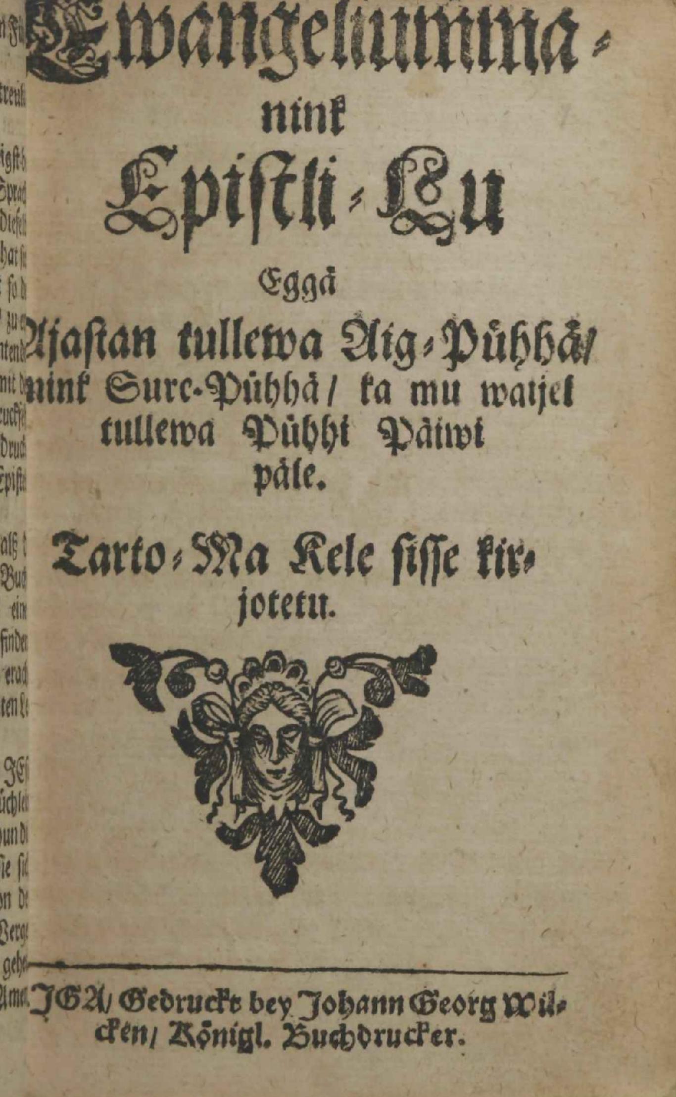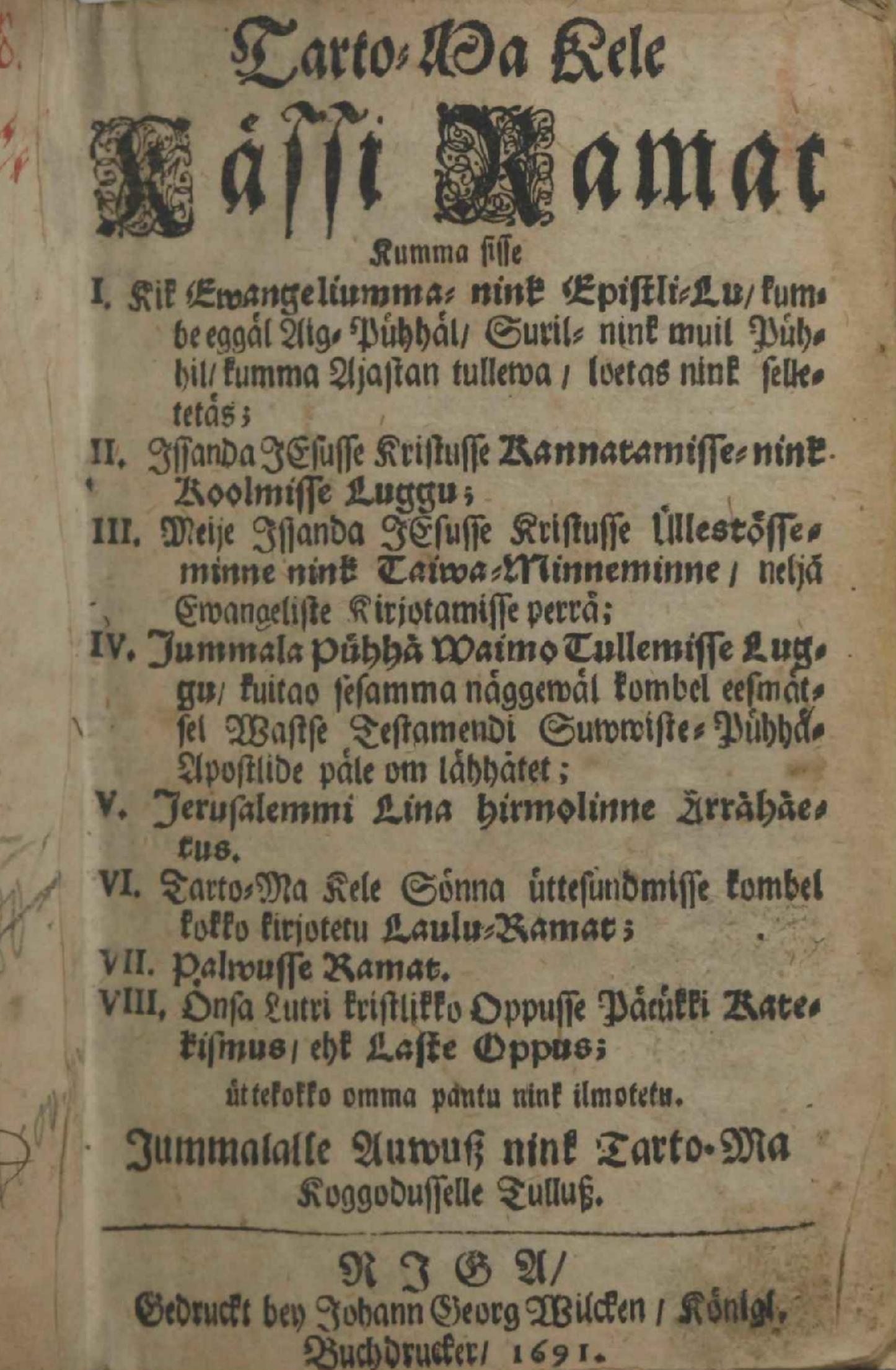 üttekokko omma pantu nink ilmotetu. Jummalalle Auwusz nink Tarto-Ma Koggodusselle Tullusz. RIGA, Gedruckt bey Johann Georg Wilcken, Königl. Buchdrucker, 1691